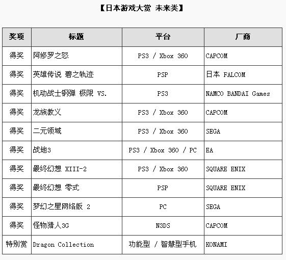 一般社团法人电脑娱乐供应商协会(CESA),于日前公布今年迈入第15届的“日本游戏大赏”之“年度作品类”与“未来类”的得奖名单,其中《怪物猎人》与《英雄传说》在2个类别都获得肯定。