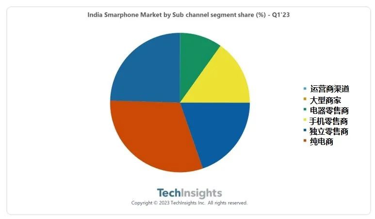 TechInsights 称,在 2023 年 Q1,印度线下分销渠道占智能手机出货量的 57%。手机零售商 (多波段零售店) 的份额达到了 15% 以上的峰值,是连续 20 多个季度中细分渠道市场的最高份额。手机厂商正越来越多地寻求对分销的直接控制,预计它们将加快在印度一线城市开设高端体验店的进程。