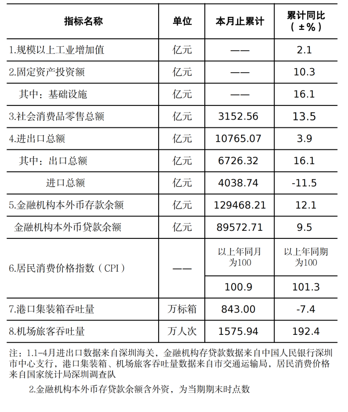 深圳统计局:2023年4月深圳市统计指标 更多阅读:中国人民银行:2019年第一季度城镇储户问卷调查报告中国统计局:2018年1-8月份全国规模以上工业企业利润增长16.2%商务部:2017年全年全国吸收外资情况中国人民银行:2023年二季度末金融业机构总资产449.21万亿元国家统计局:2024年1—6月份全国固定资产投资增长3.9%国家统计局:2024年6月份工业生产者出厂价格同比降幅继续收窄国家统计局:2024年1—5月份全国规模以上工业企业利润增长3.4%深房中协:2024年6月3日-9日深圳二手房交易量深房中协:2024年6月17-23日深圳市二手房周交易量国家统计局:2023年8月中国采购经理指数运行情况海关总署:2023年前8个月进出口基本持平 8月份进出口环比增3.9%国家统计局:2023年1—7月份全国规模以上工业企业利润下降15.5%国家统计局:2023年8月中旬流通领域重要生产资料市场价格变动情况财政部:2023年1-7月全国国有及国有控股企业经济运行情况国家统计局: 2022年我国经济发展新动能指数比上年增长28.4%