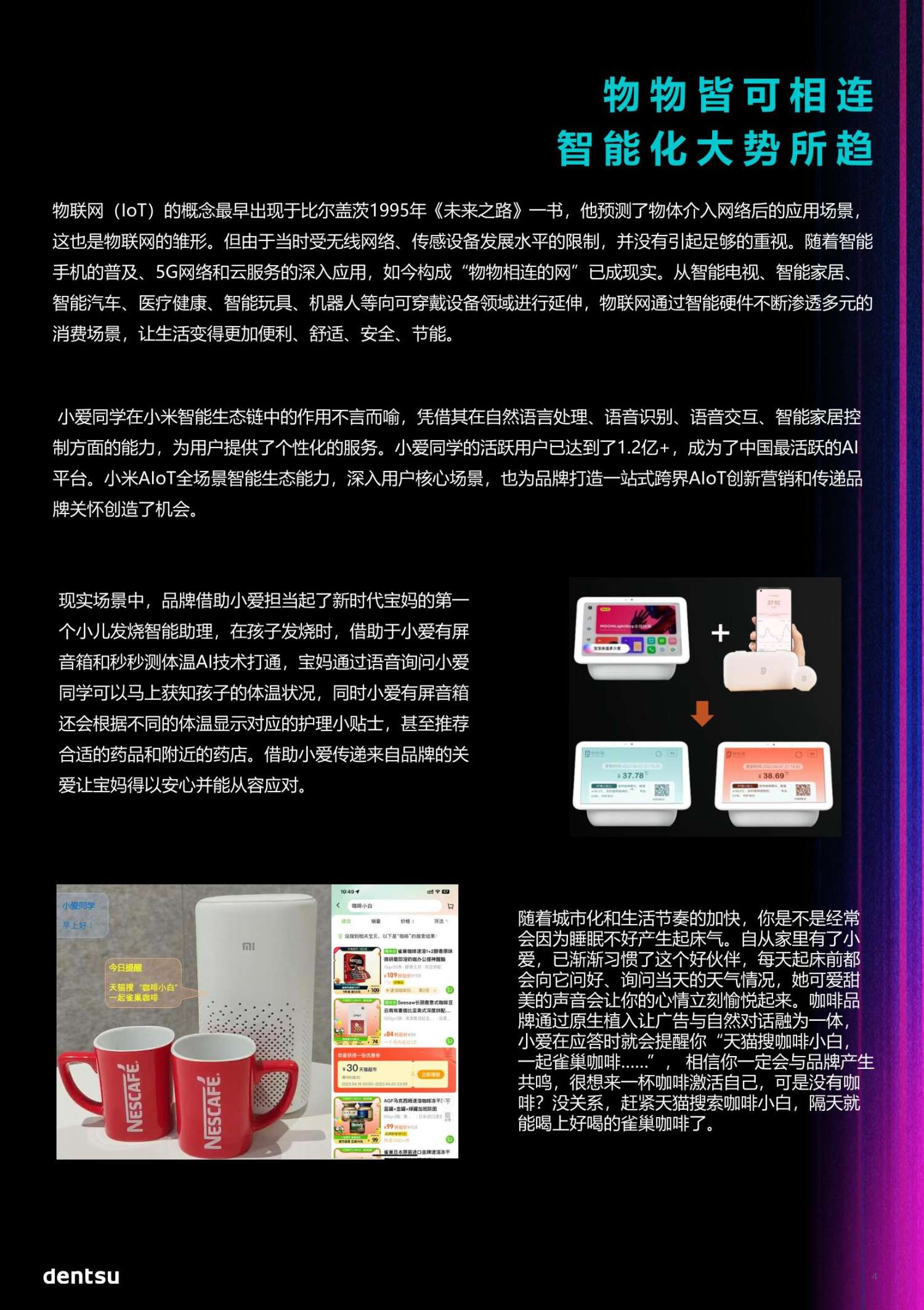 随着智能手机、5G、和云服务的普及和应用,“物物相连”得以变为现实。物联网通过智能硬件不断渗透多元的消费场景,也为品牌打造一站式跨界AIoT创新营销创造了更多机遇。未来,物联网与人工智能将有机会更加紧密地融合,实现万物数据化和智联化,为品牌带来更加个性化、智能化的用户体验。