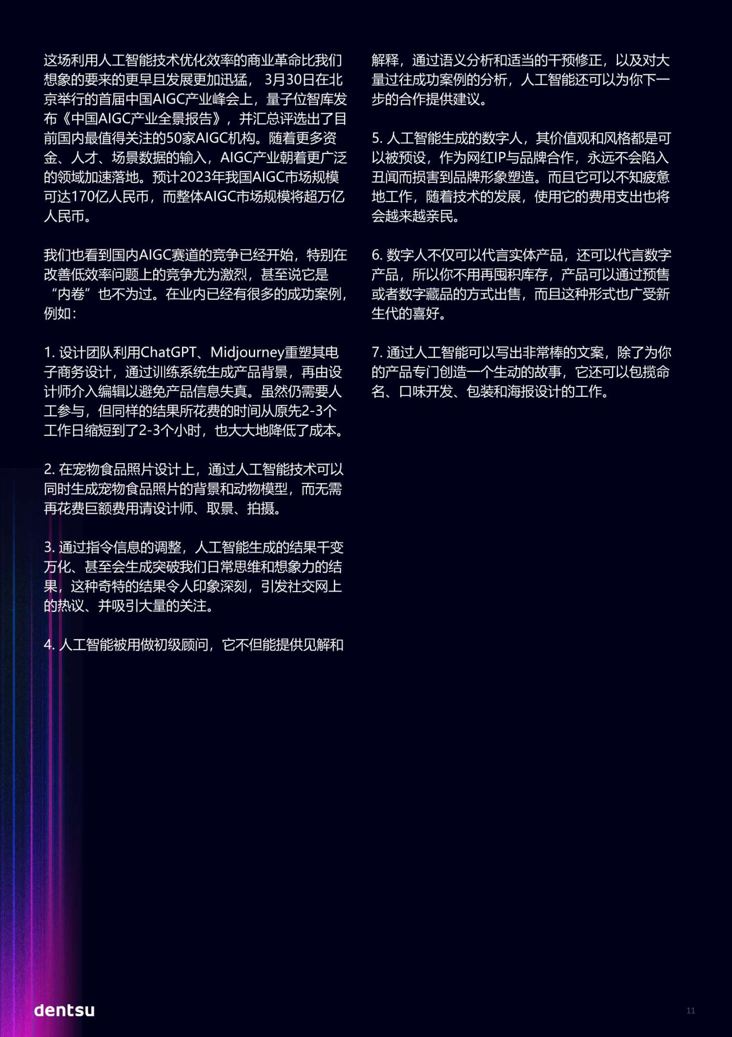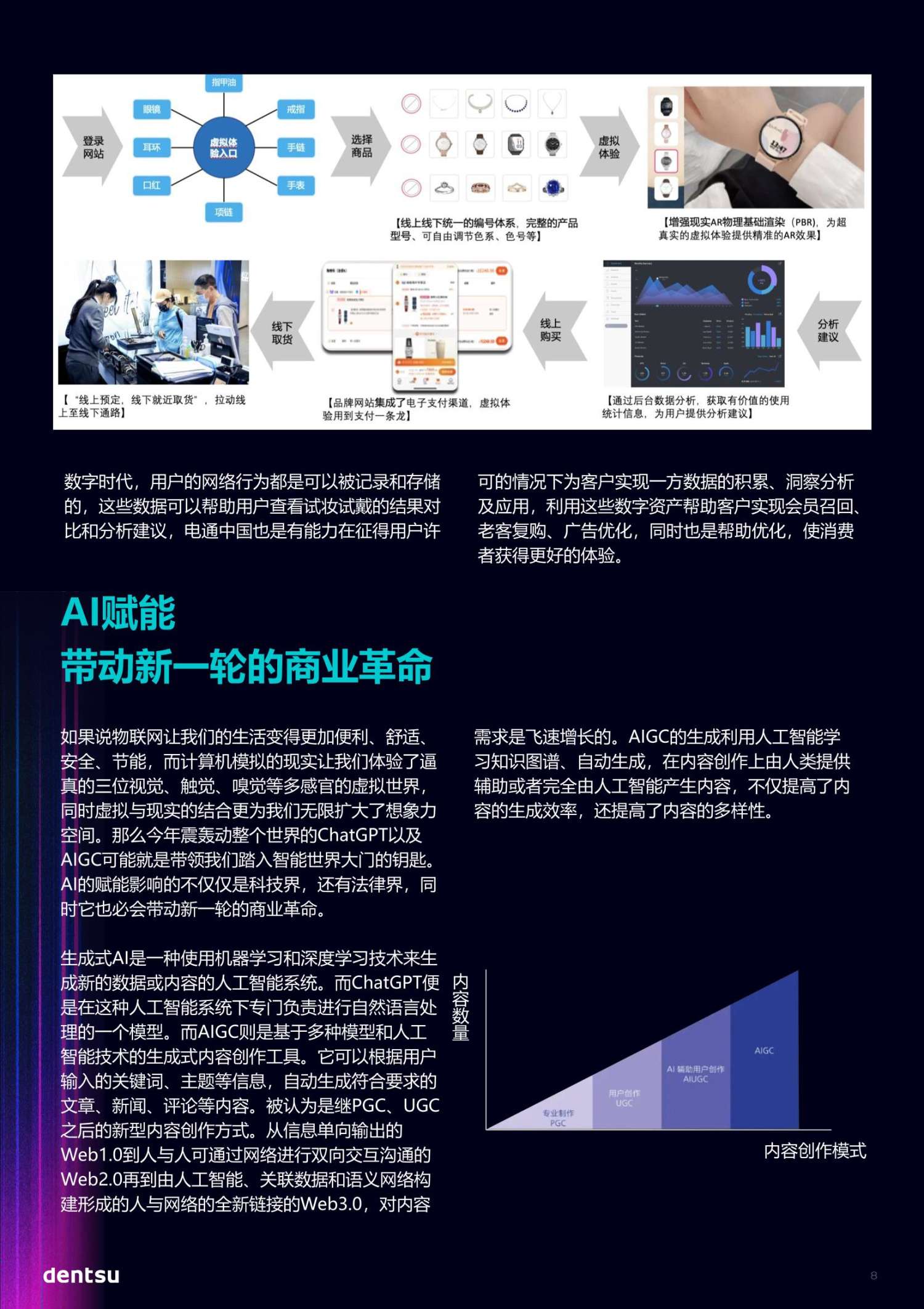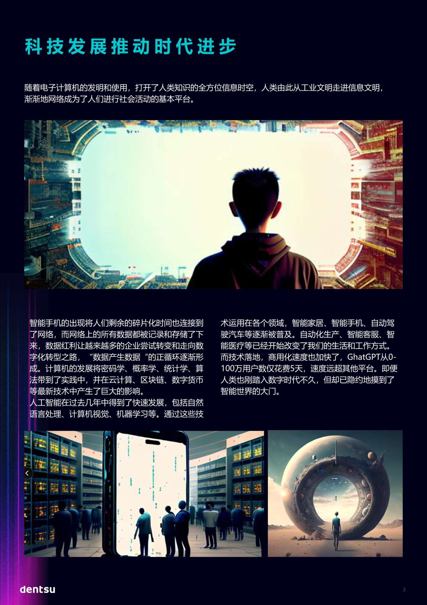 虚拟与现实的结合已经为我们无限扩大了想象的空间与边界。ChatGPT、Midjourney等AIGC技术与平台也带来了踏入智能世界大门的钥匙。利用人工智能学习知识图谱、自动生成,AIGC不仅大幅提高了内容的生成效率,还提高了内容的丰富与多样性。2023年,AI赋能为营销行业带来的更大的机遇、更灵活的营销手段、更高效的成本控制、以及更具个性化的营销体验。电通也将为生态企业和品牌主搭建合作共赢的桥梁,加强创新力和服务质量,利用新技术和数据帮助品牌提升行业竞争力、驱动品牌持续增长。