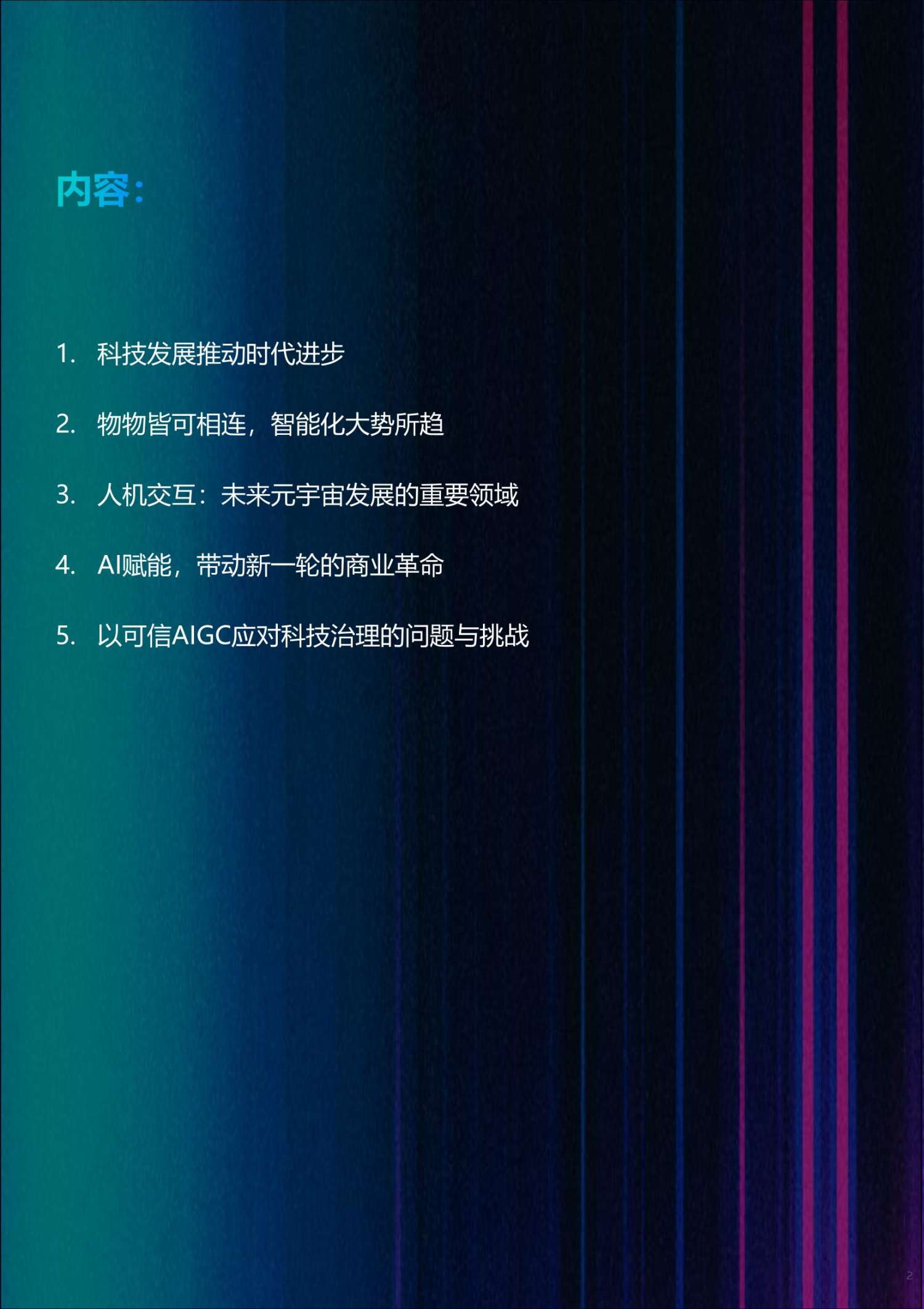 该报告共分为五大章节,分别介绍了物联网、人机交互、AIGC在未来营销中的广泛应用以及机遇,同时也分析了科技治理可能面临的问题和挑战。