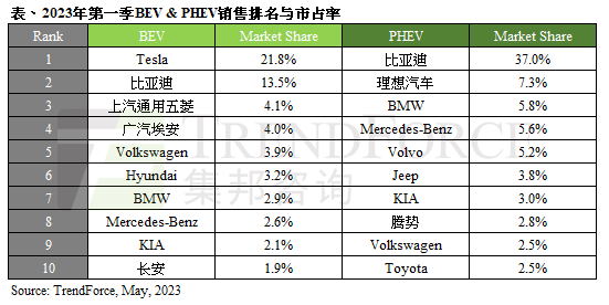 TrendForce 集邦表示,“插电混合式电动车方面,比亚迪以市占率 37% 持续稳居第一,比亚迪与戴姆勒集团合资的电动车品牌腾势(Denza)也在第一季跃上第八名。比亚迪多品牌策略已成形,除了腾势外还有定位在豪华高端的「仰望」品牌将加入战局。理想汽车第一季窜升至第二名,多车款为其带来单季销售 5.2 万辆的成绩,市占率提高至 7.3%。三大欧系豪华车品牌 BMW、Mercedes-Benz、Volvo 在 PHEV 销售排名仍位居前段,但销量相较去年同期有所下滑。”