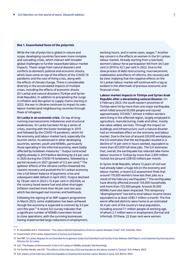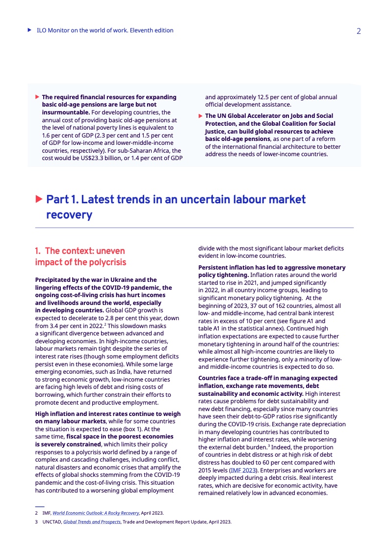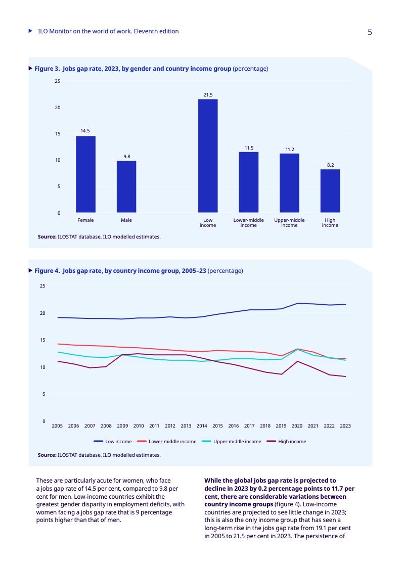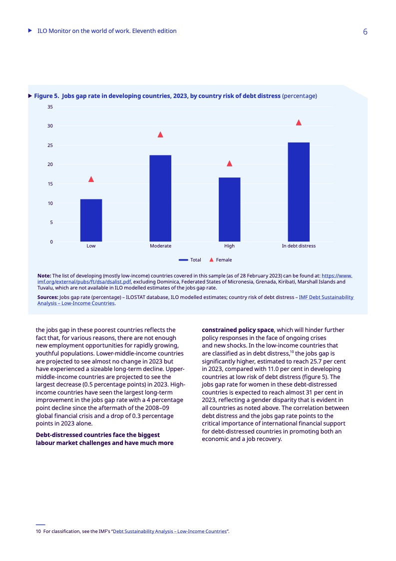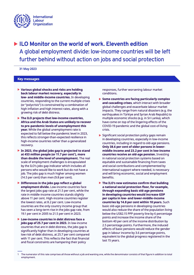对于发展中国家来说,不断上升的债务水平增加了额外的挑战,大大缩小了政策干预的范围。金融和财政限制阻碍了对复杂威胁的回应,包括冲突、自然灾害和经济危机,这些危机往往会自我强化(多重危机),从而加剧就业差距。根据该报告,受债务困扰的低收入发展中国家面临的就业差距明显增大,2023年将达到25.7%,而受债务困扰风险较低的发展中国家则为11%。