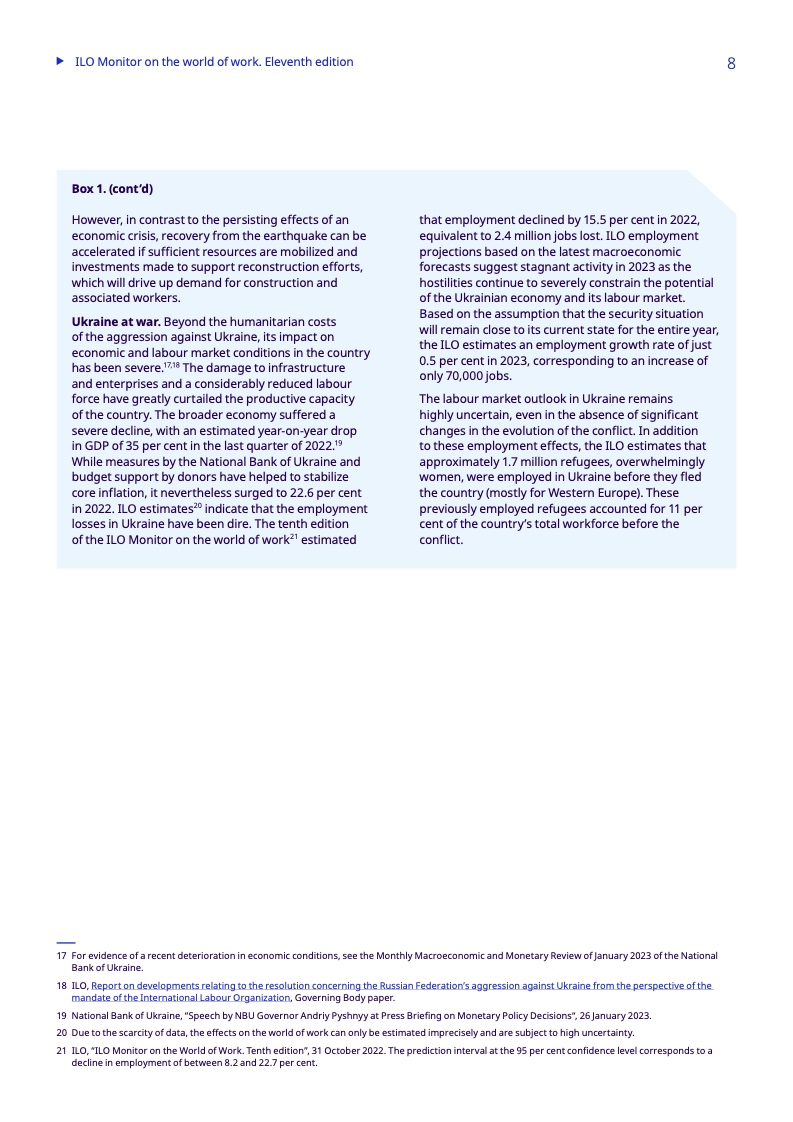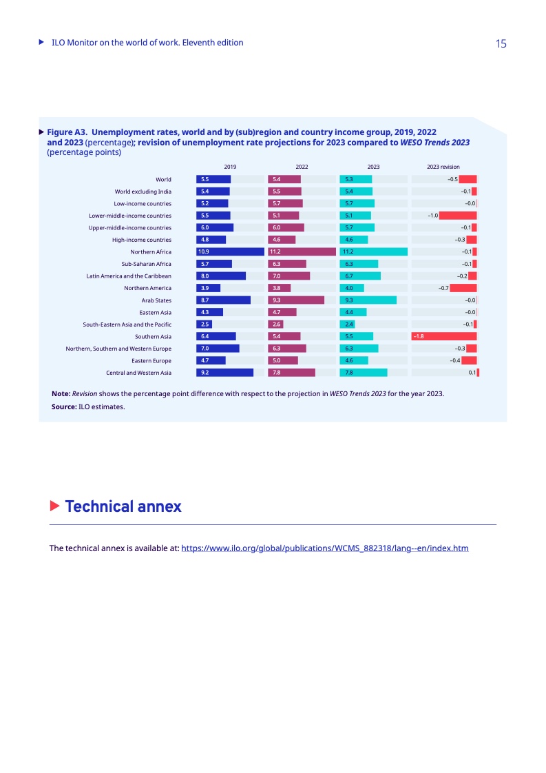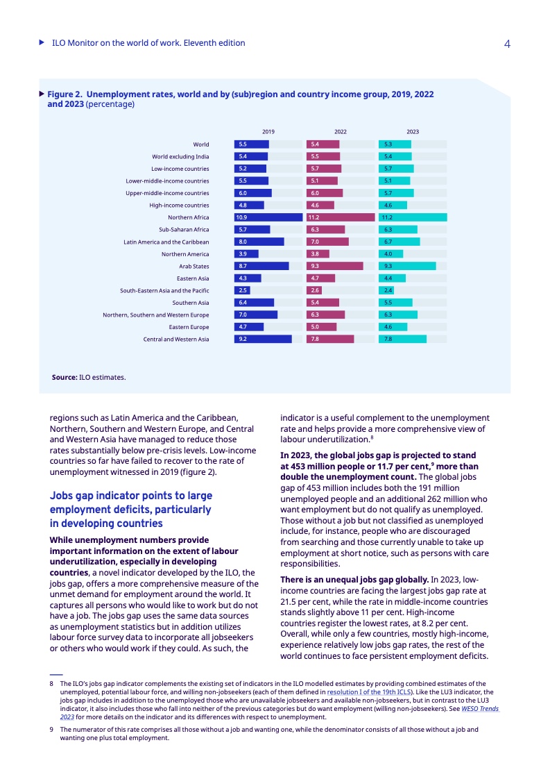 其他地区已设法使失业率大幅下降到低于危机前的水平,拉丁美洲和加勒比地区为6.7%(2019年为8.0%),北欧、南欧和西欧为6.3%(2019年为7.0%),中亚和西亚为7.8%(2019年为9.2%)。