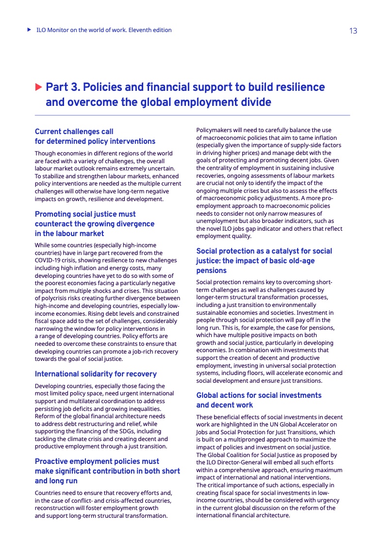 这项分析凸显了在多重危机和冲击时期为创造就业和社会保障提供强有力的全球财政支持的重要性,以确保恢复和重建不会遗漏任何人,并支持长期的结构转型。报告强调了为低收入国家的社会投资创造财政空间极其重要。这需要作为当前全球国际金融结构改革讨论的一部分,紧急加以考虑。