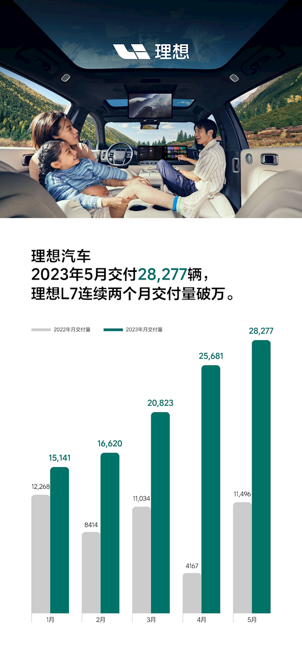 5月份,理想汽车共交付新车28,277辆,同比增长146%。理想汽车连续三个月交付超2万辆,同时理想L7连续两个月交付量破万。截止到2023年5月31日,理想汽车累计交付量为363,876辆。