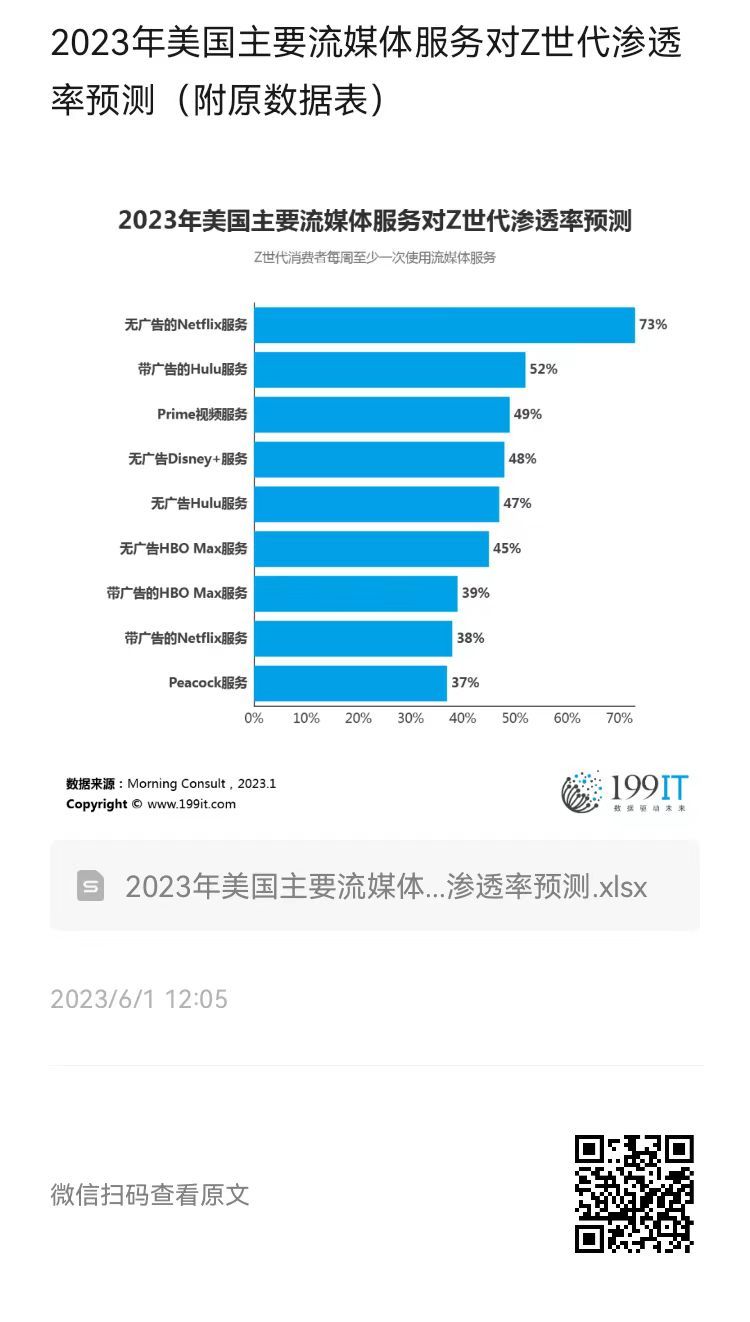2023年美国主要流媒体服务对Z世代渗透率预测(附原数据表) ​​​