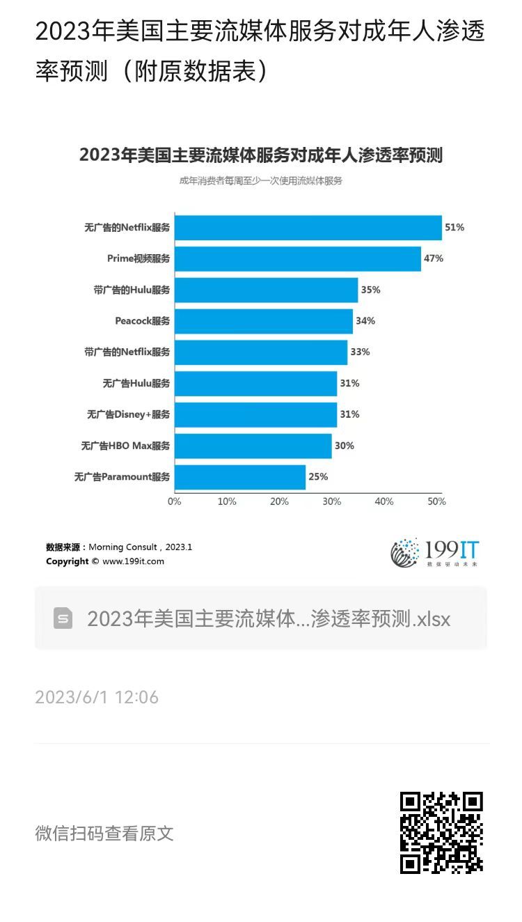 2023年美国主要流媒体服务对成年人渗透率预测(附原数据表) 更多阅读:StreamElements:2019年视频流报告报告:体育在全球流媒体大战中的作用Mediaocea:2024下半年营销报告Fandom:2022年流媒体报告Hub ER:近63%的美国人驾车时都使用 OTA 收音机Attest:2021年美国媒体访问报告SVOD:2021年针对每项服务的流媒体数量下降流媒体之战:疫情对联网电视的影响报告Pact:流媒体对新内容的出价高于广播RIAA:2019年流媒体音乐收入增长近20%App Annie:迪士尼+在欧洲的下载量达到500万次H Code:2020年拉美裔美国人网络行为调查报告YouGov:2020年流媒体服务报告Qualtrics:糟糕的客户体验导致企业平均损失3%的收入疫情刺激了流媒体的临界点