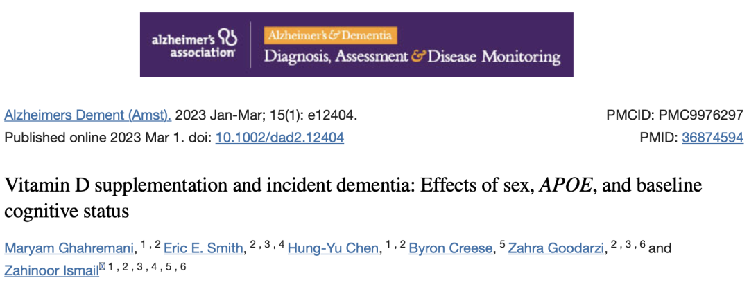 [1]Ghahremani M, Smith EE, Chen HY, Creese B, Goodarzi Z, Ismail Z. Vitamin D supplementation and incident dementia: Effects of sex, APOE, and baseline cognitive status. Alzheimers Dement (Amst). 2023 Mar 1;15(1):e12404. doi: 10.1002/dad2.12404. PMID: 36874594; PMCID: PMC9976297.