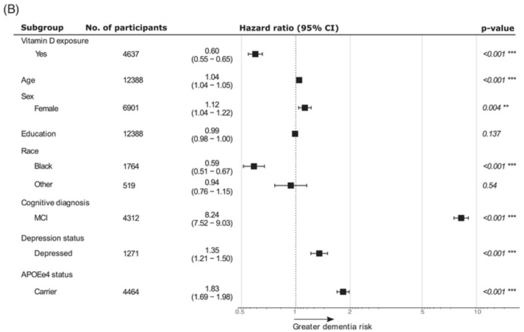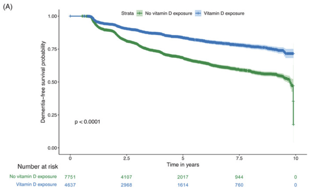果不其然,在维生素D补充剂的加持下,参与者有着更高的无痴呆生存率以及更低的痴呆症发病风险。