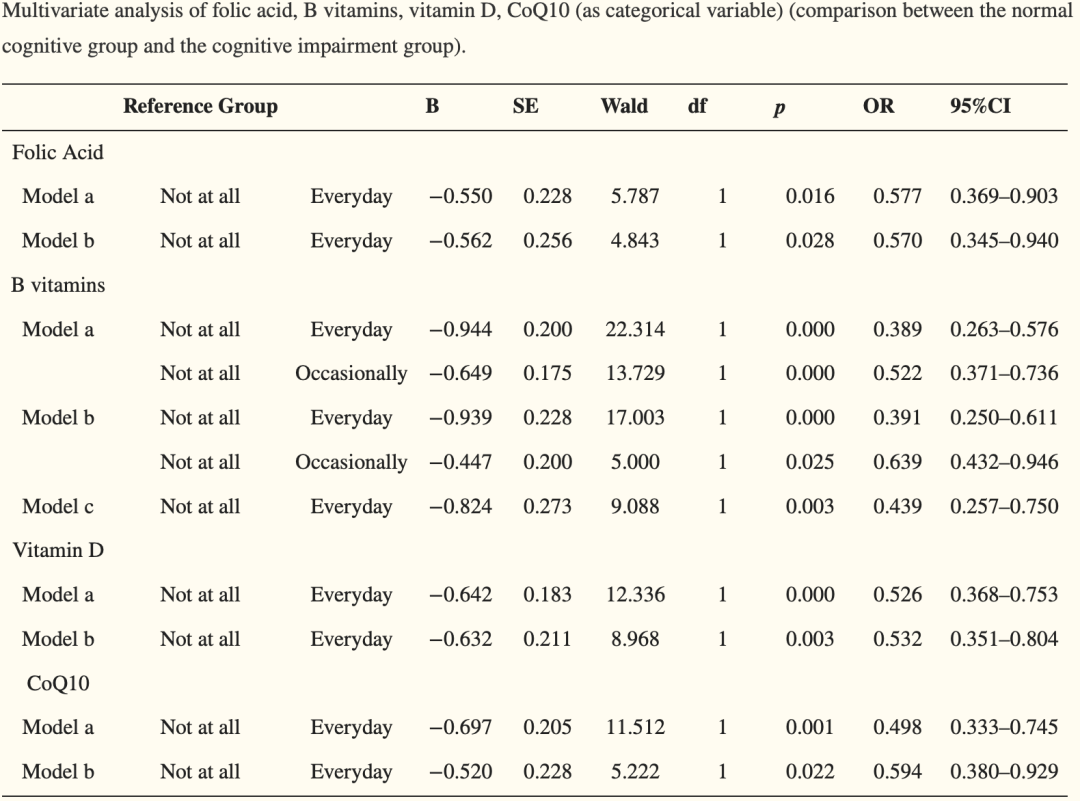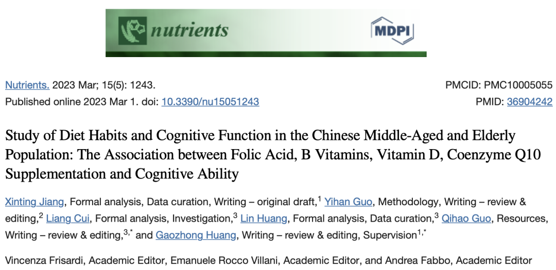 [3]Jiang X, Guo Y, Cui L, Huang L, Guo Q, Huang G. Study of Diet Habits and Cognitive Function in the Chinese Middle-Aged and Elderly Population: The Association between Folic Acid, B Vitamins, Vitamin D, Coenzyme Q10 Supplementation and Cognitive Ability. Nutrients. . 2023;15(5). doi:10.3390/nu15051243