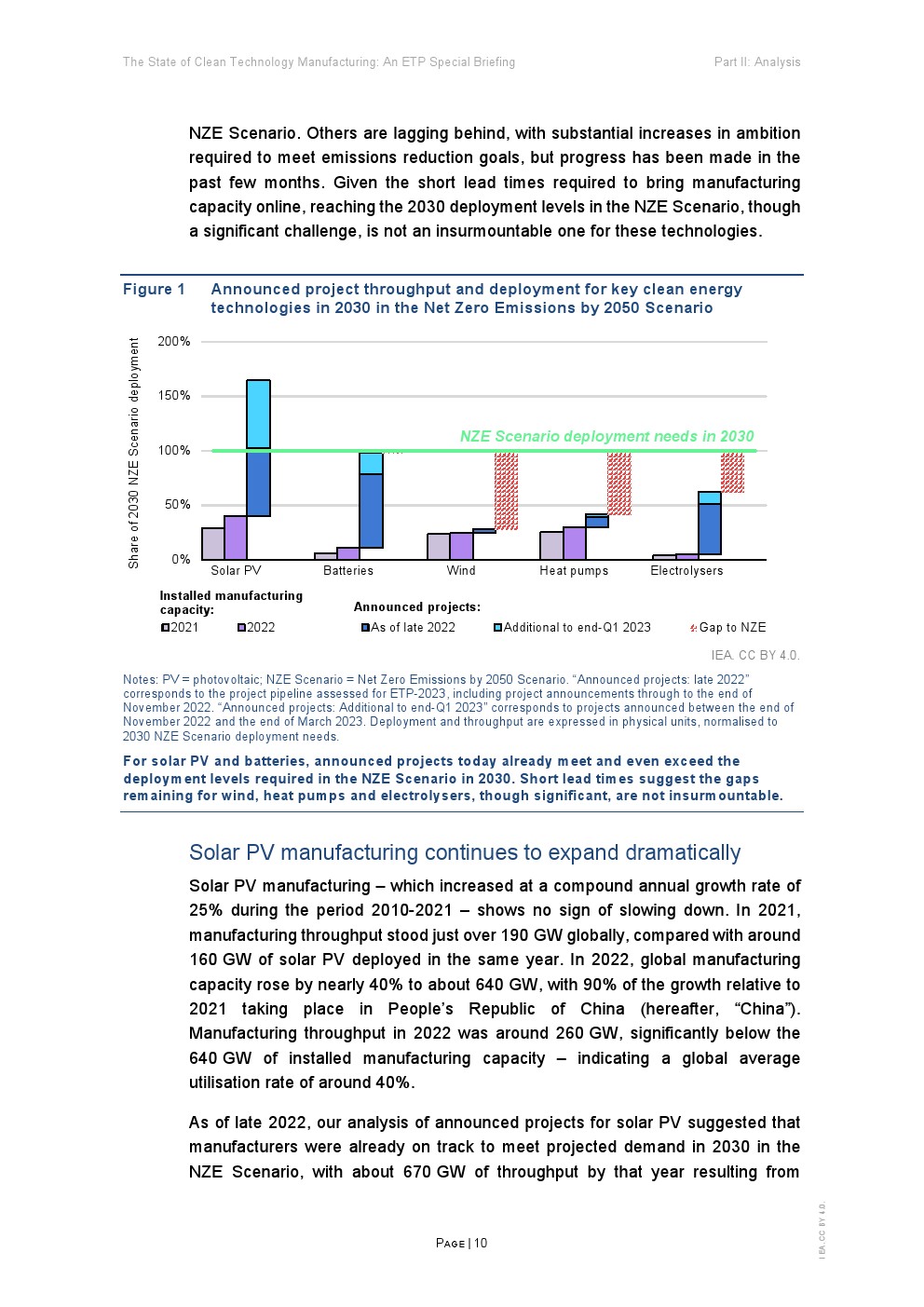宣布的电池制造能力项目几乎可以满足2030年NZE情景的所有全球部署需求。风电、电解槽(略高于60%)和热泵(略高于40%)仍然存在巨大差距,现有产能和已宣布项目的预计吞吐量相当于NZE情景部署水平的不到30%。