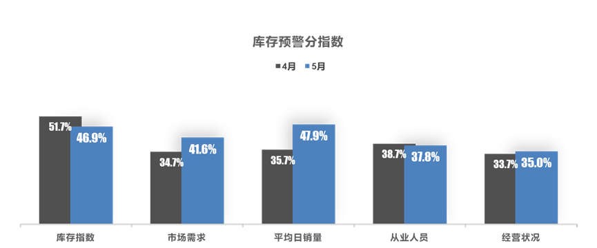 从分指数情况看:5月库存、从业人员指数环比下降,市场需求、平均日销量、经营状况指数环比上升。五一期间,各地大小营销活动陆续启动,汽车市场需求回暖,经销商盈利水平有所提升。