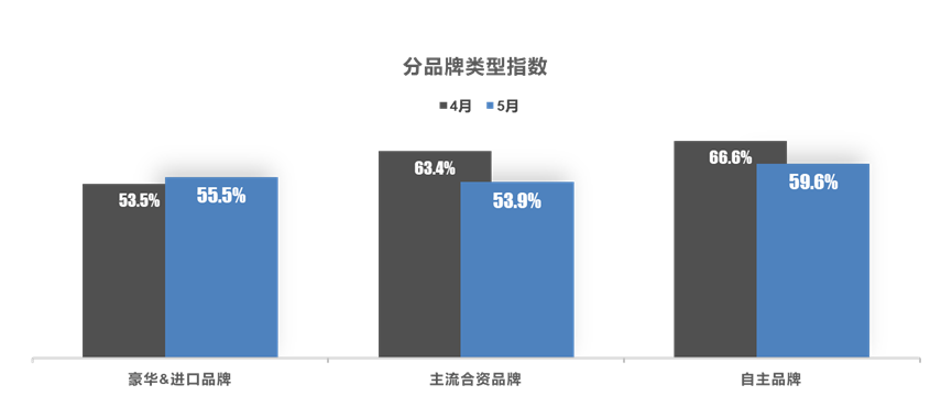 从分品牌类型指数看:5月进口&豪华品牌指数环比上升,合资品牌、自主品牌指数环比下降。