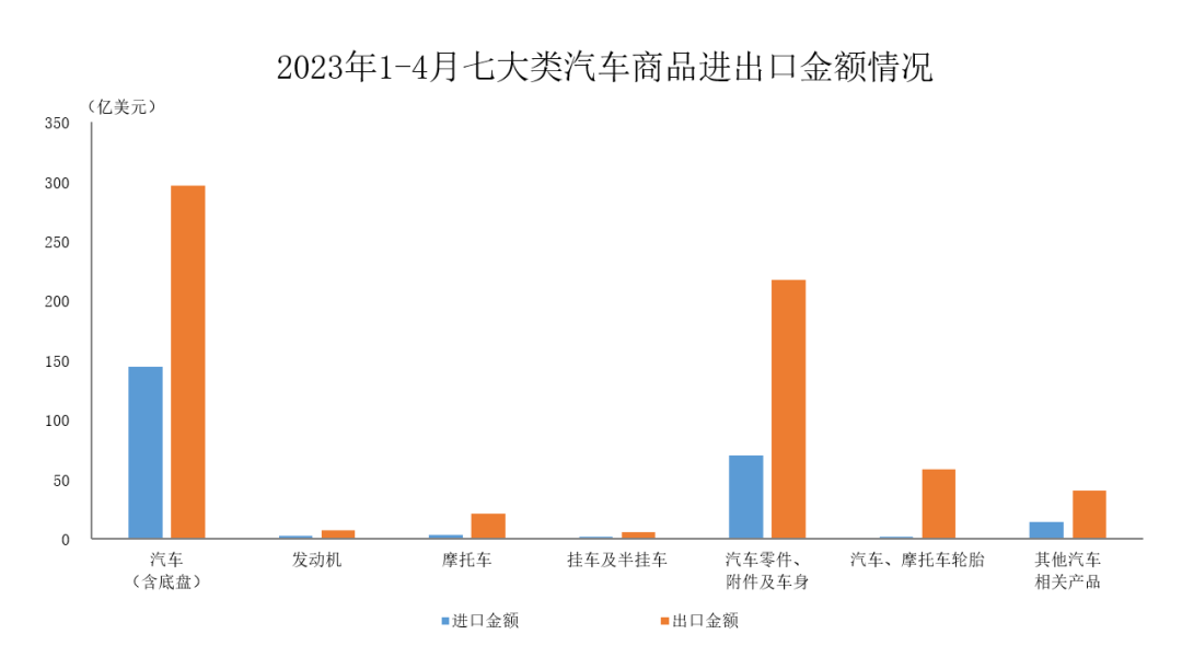 2023年1-4月,全国汽车商品累计进出口总额为884.4亿美元,同比增长13.9%。其中进口金额236.7亿美元,同比下降26.5%;出口金额647.7亿美元,同比增长42.4%。