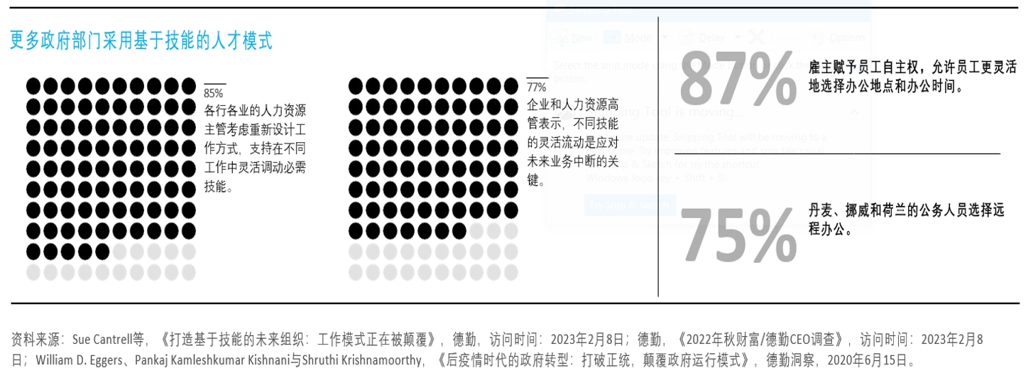 - 从传统工作方式向新工作方式转型:随着加快采用灵活的新工作方式,政府部门的工作场所正在经历更深刻的变化。公共部门继续实施疫情期间的政策,例如远程办公或混合办公、虚拟服务交付等,允许员工灵活办公。 越来越多管理者采用流动性的人才管理模式,例如支持自由职业和零工等。