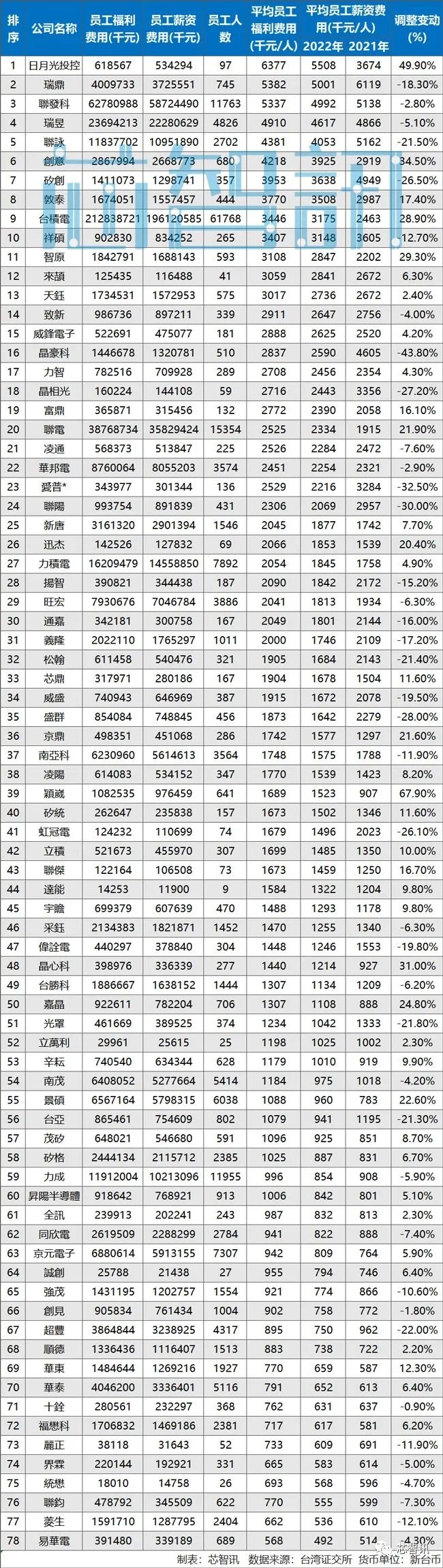 2022年度,中国台湾上市半导体企业的员工平均薪资(年薪)排名前十的企业依次为: