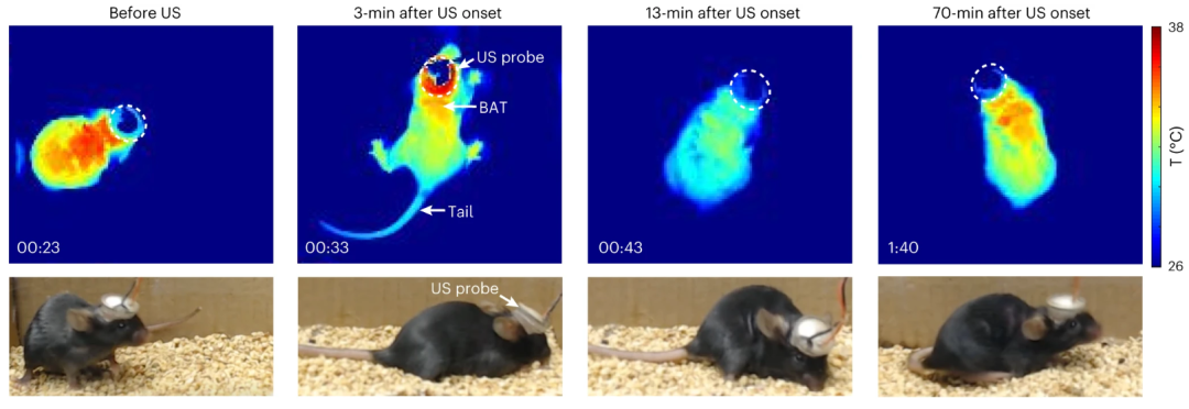 通过红外相机,可以观察到超声波开启之后,小鼠棕色脂肪所在的肩胛部分温度显著降低,而小鼠尾部温度有所升高。啮齿类动物体温调节的两大机制就是棕色脂肪产热和尾部血管舒张散热,这说明超声刺激POA使得小鼠“双管齐下”走向体温降低。从视频记录可以看出,小鼠的活动也减少了。