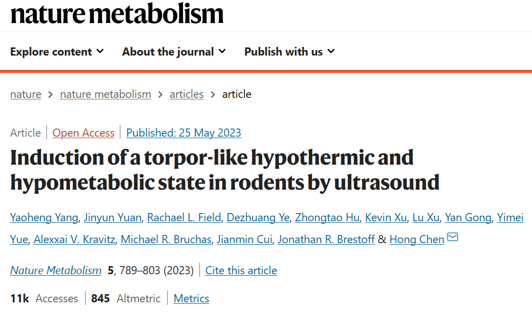 [1]Yang, Y., Yuan, J., Field, R.L. et al. Induction of a torpor-like hypothermic and hypometabolic state in rodents by ultrasound. Nat Metab 5, 789–803 (2023). https://doi.org/10.1038/s42255-023-00804-z