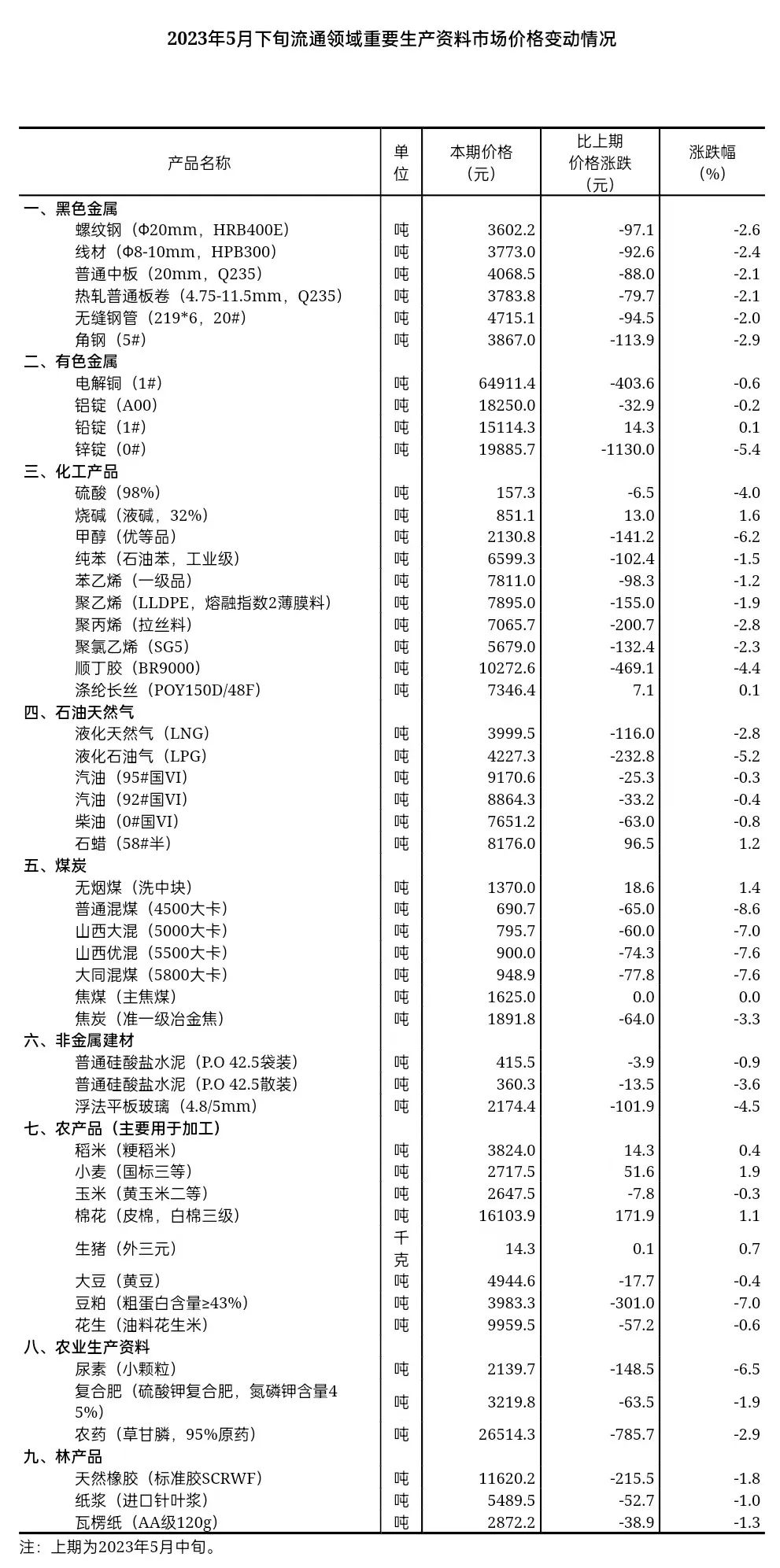 国家统计局:2023年5月下旬流通领域重要生产资料市场价格变动情况 据对全国流通领域9大类50种重要生产资料市场价格的监测显示,2023年5月下旬与5月中旬相比,9种产品价格上涨,40种下降,1种持平。 更多阅读:2023年2月下旬流通领域重要生产资料市场价格变动情况国家统计局:2022年10月下旬流通领域重要生产资料市场价格变动情况国家统计局:2023年4月下旬流通领域重要生产资料市场价格变动情况国家统计局:2023年8月下旬流通领域重要生产资料市场价格变动情况国家统计局:2022年4月下旬流通领域重要生产资料市场价格变动情况中国人民银行:2019年第一季度城镇储户问卷调查报告商务部:2017年全年全国吸收外资情况中国统计局:2018年1-8月份全国规模以上工业企业利润增长16.2%国家统计局:2024年1—5月份全国固定资产投资增长4.0%国家统计局:2024年5月中国采购经理指数运行情况中国人民银行:2023年二季度末金融业机构总资产449.21万亿元国家统计局:2024年6月份工业生产者出厂价格同比降幅继续收窄国家统计局:2024年1—6月份全国固定资产投资增长3.9%国家统计局:2024年1—5月份全国规模以上工业企业利润增长3.4%深房中协:2024年6月3日-9日深圳二手房交易量