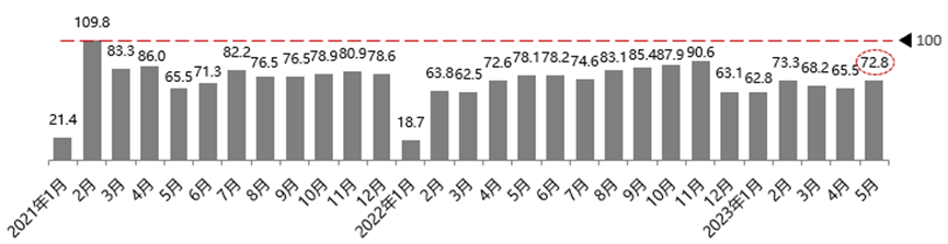 从构成汽车消费指数的分指数看,2023年5月需求分指数为72.8,高于上月,预期2023年6月购车需求有所提升。6月,部分经销商为了完成上半年销售目标而开展促销冲量活动,会促进客户购车需求提升,但结合6月是传统汽车消费淡季,需求提升幅度不会太大。