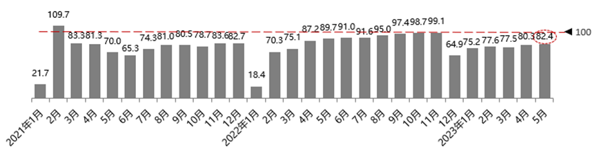 2023年5月购买分指数为82.4,略高于上月,预期2023年6月汽车购买情况同5月基本持平或有小幅度提升。6月,除了少量库存国6A清库及部分经销商会开展半年度促销冲量等活动外,其他没有太大的影响市场的因素,整体看6月汽车销量会比较平稳,不会有太大幅度的变化。