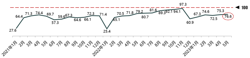 2023年6月5日,中国汽车流通协会发布最新一期“汽车消费指数”:2023年5月份汽车消费指数为76.6,略高于上月。