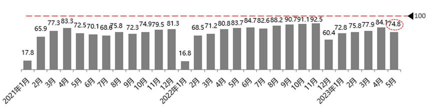 2023年5月入店分指数为74.8,低于上月,预期6月消费者入店购车人数会有所减少。6月,随着气温的升高,以及前期价格等因素造成部分客户还在观望等原因,如果6月没有大力度的促销政策消费者入店购车人数将会受到一定的影响。