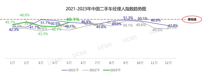 2023年6月1日,中国汽车流通协会发布最新一期“中国二手车经理人指数”(UCMI)。本期UCMI结果显示,5月份二手车经理人指数为48.1%,处于荣枯线以下,二手车市场景气度处于不景气区间。