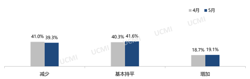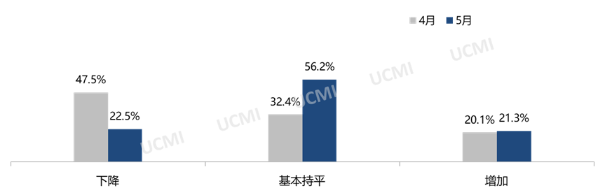 调查显示,5月份市场总需有所减少,二手车经理人认为“减少”的比例为39.3%;“增加”的比例为19.1%;“持平”的比例为41.6%。