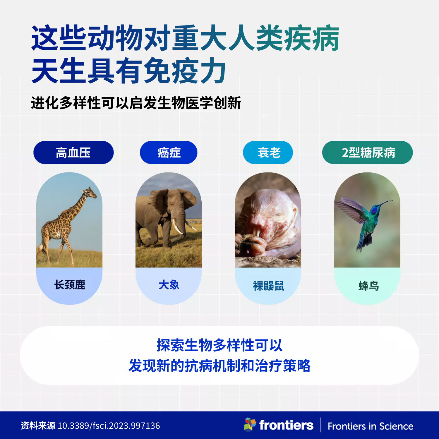 大象很少得癌症。而长颈鹿虽然血压是所有动物中最高的,却不会受高血压影响,如肾脏损伤和中风。由于进化特性,它们不受人类一些重大疾病的影响,而这仅仅是动物届的其中两个例子。但这仅是问题的表面。在自然界的生物多样性中,随处可见各种抗病机制。系统地搜寻这些机制并研究其背后的生物学原理,能够帮人类克服很多重大疾病和医疗问题,例如糖尿病、衰老等等。
