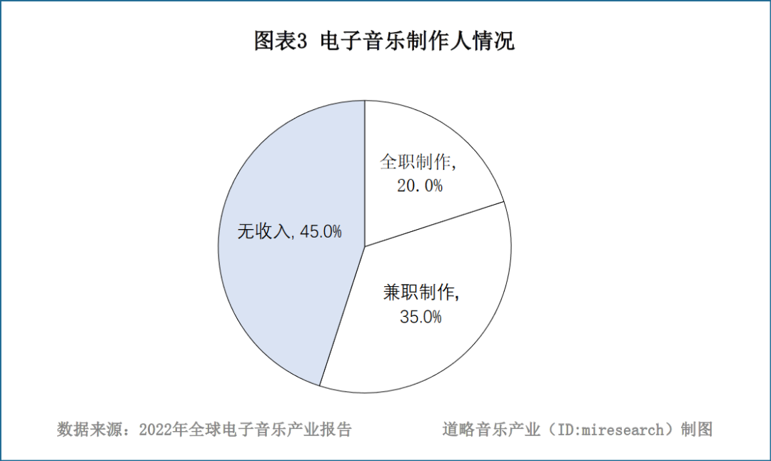 从电子音乐人的层面来说,只有20%的电子音乐人能够以电子音乐创作为生,45%的电子音乐人没有从电子音乐制作中获得收入。超八成的非专业电子音乐人认为玩电子音乐只是出于自己的热情。全球的音乐制作行业在2022年达到了66亿美元的收入,其中有28亿美元是来自舞曲制作人和DJ。