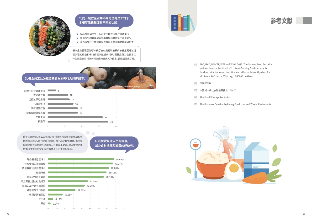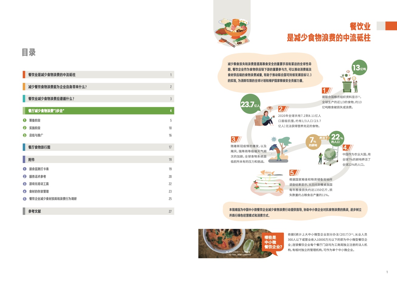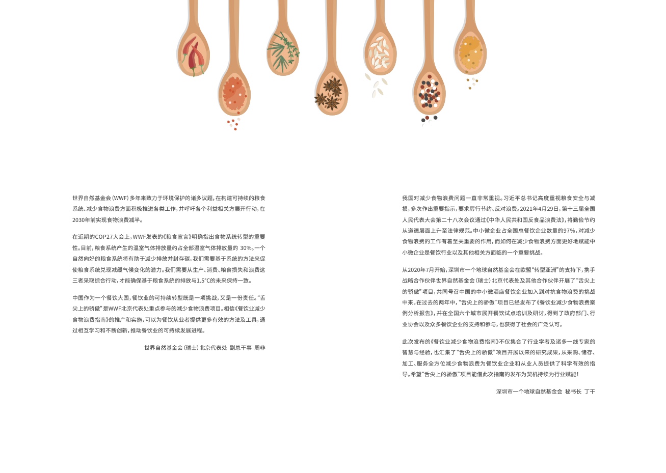 减少粮食损失和浪费是提高粮食安全的重要手段和紧迫的全球性命 题。餐饮企业作为食物供应链下游的重要参与方,可以推动消费端及 食材供应端的食物浪费减量,有助于推动联合国可持续发展目标12.3 的实现,为消除饥饿的全球计划和维护国家粮食安全贡献力量。