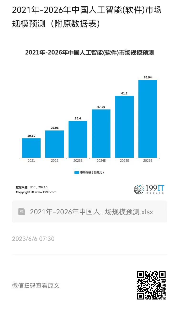 2021年-2026年中国人工智能(软件)市场规模预测(附原数据表) 更多阅读:TechEquity:2025年人工智能与劳动力发展报告Accenture:调查显示企业不愿花钱对员工进行人工智能培训2019年-2024年全球生成式人工智能风险投资交易额(附原数据表) 哈佛商学院:2025年智能自动化报告Ascend2:2025年AI和营销效果指数报告2024年Q2-2025年Q3欧洲人工智能行业融资额(附原数据表) 世界经济论坛报告:人工智能在行动微软:人工智能扩散报告WRITER:2025年企业采用生成式AI报告Common Sense:美国青少年和年轻人对生成式AI的看法DoubleVerify:AI、自动化和数字广告的未来思科:迈向人工智能未来的竞赛RAND:2023-2024学年美国教师人工智能工具采用不均情况ASEF:2024年人工智能与教育报告微软:2025年工作趋势指数年度报告