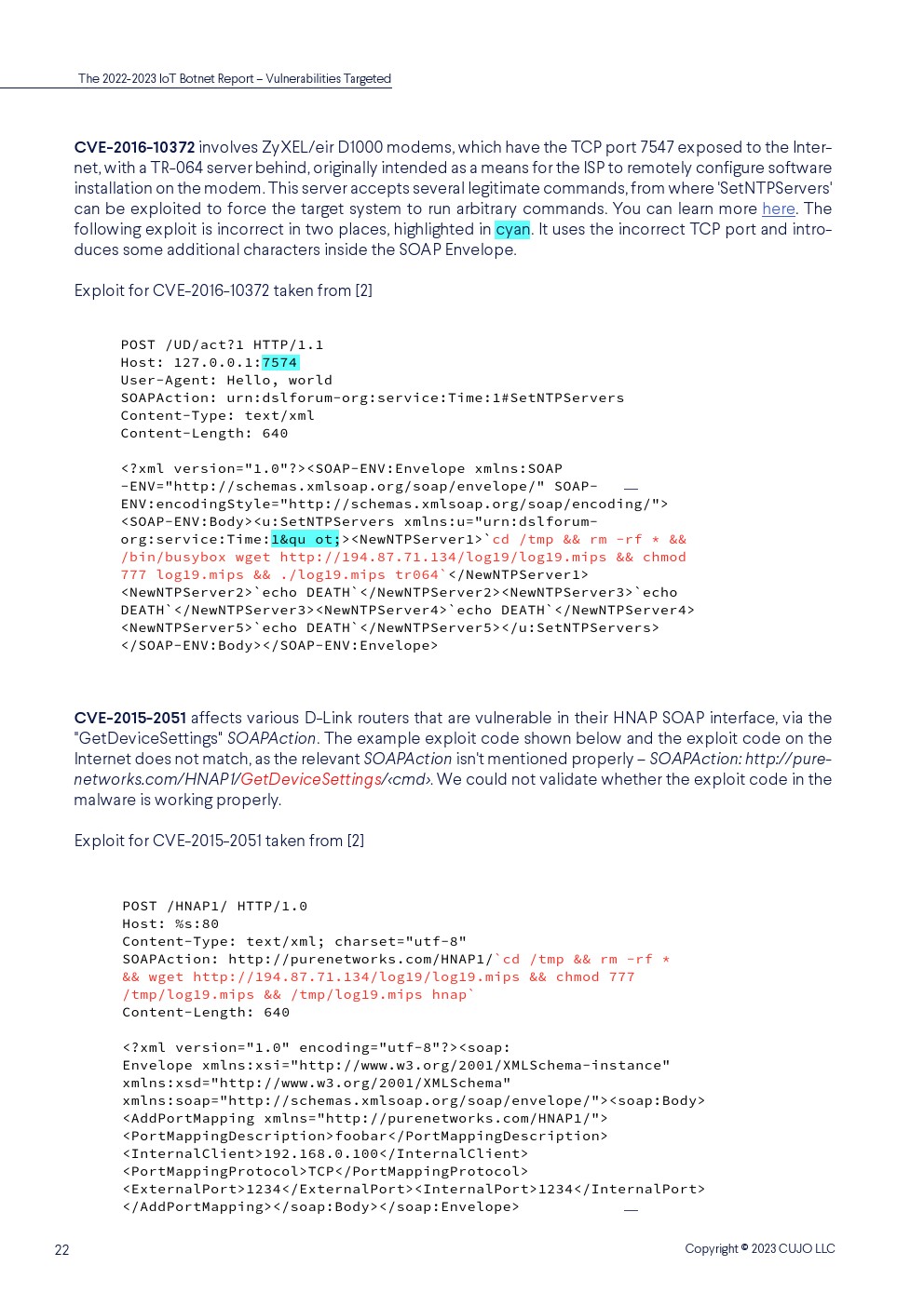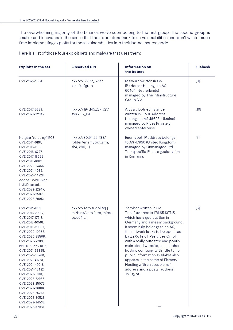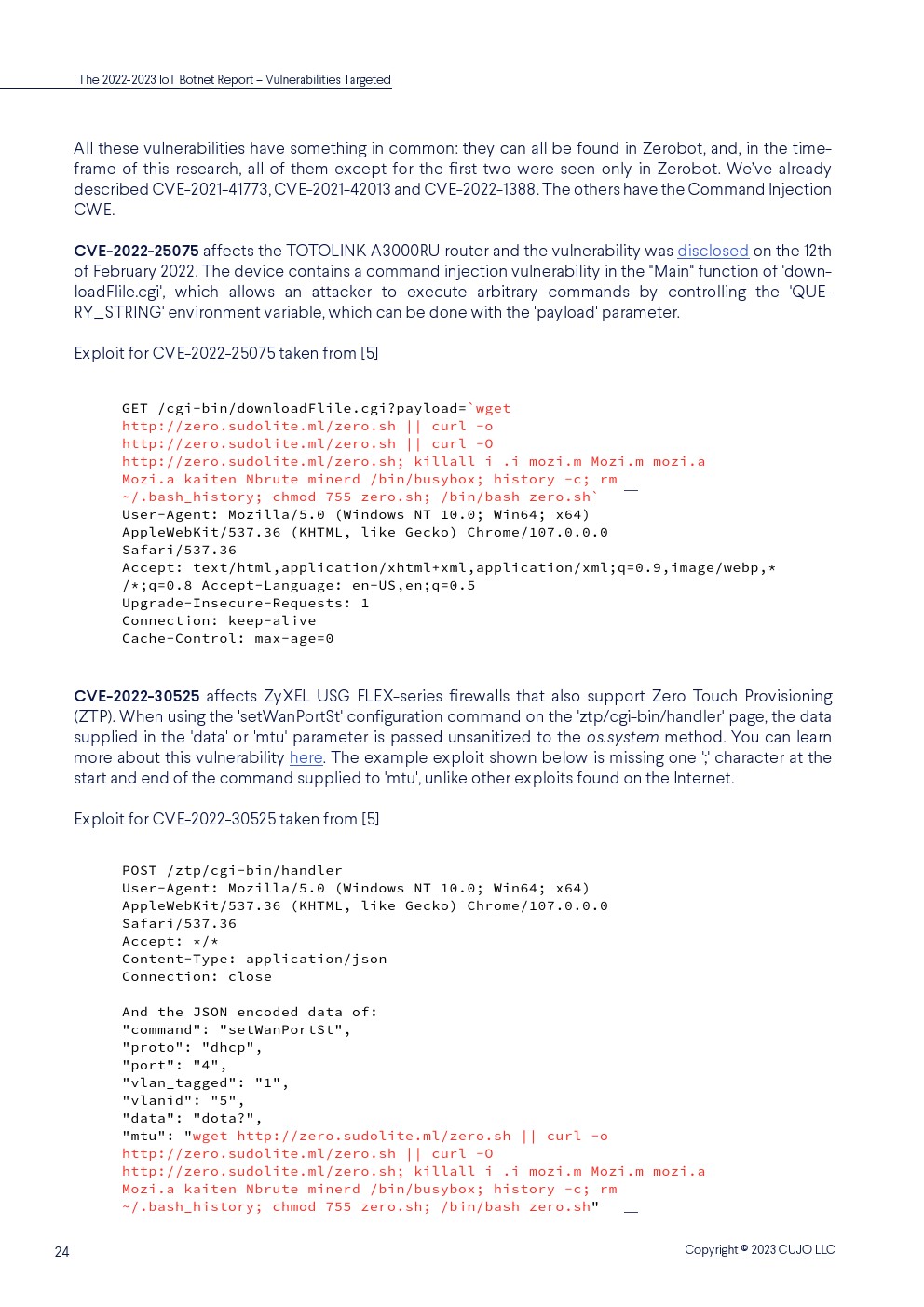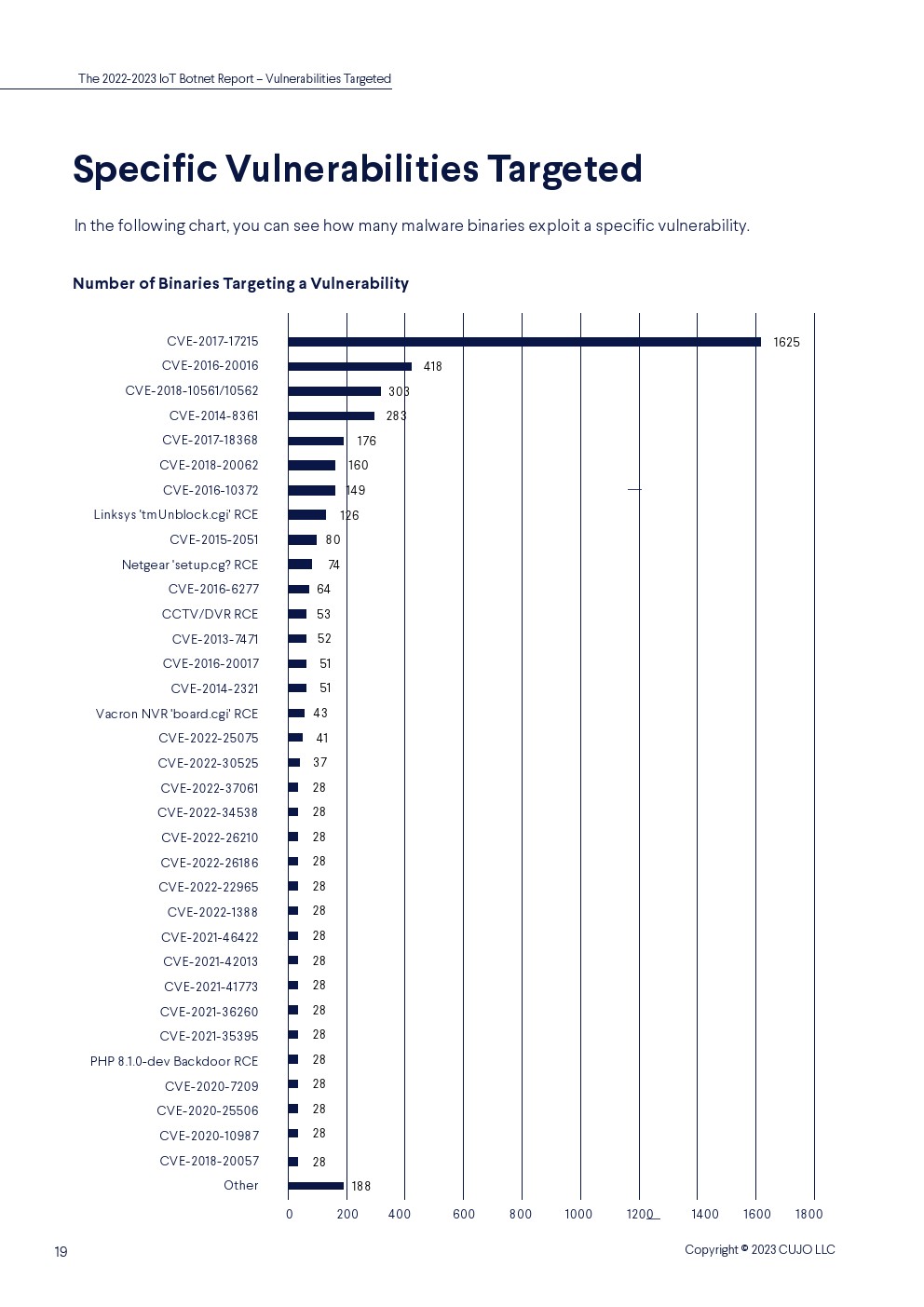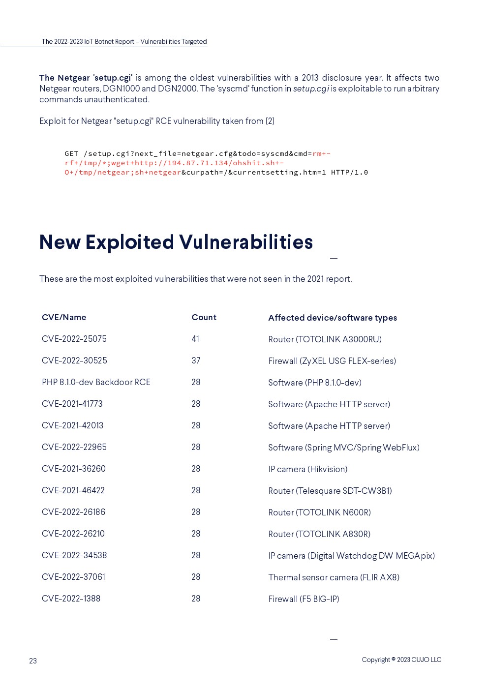 CUJO发布了“2022-2023年物联网僵尸网络报告”。2022年7月初至2023年1月底,有6471个不同的ELF二进制文件被归类为恶意,其中1685个(26%)包含至少1个漏洞利用,比2021年的8%大幅增加。共有55个漏洞被利用,是2021年的两倍多。