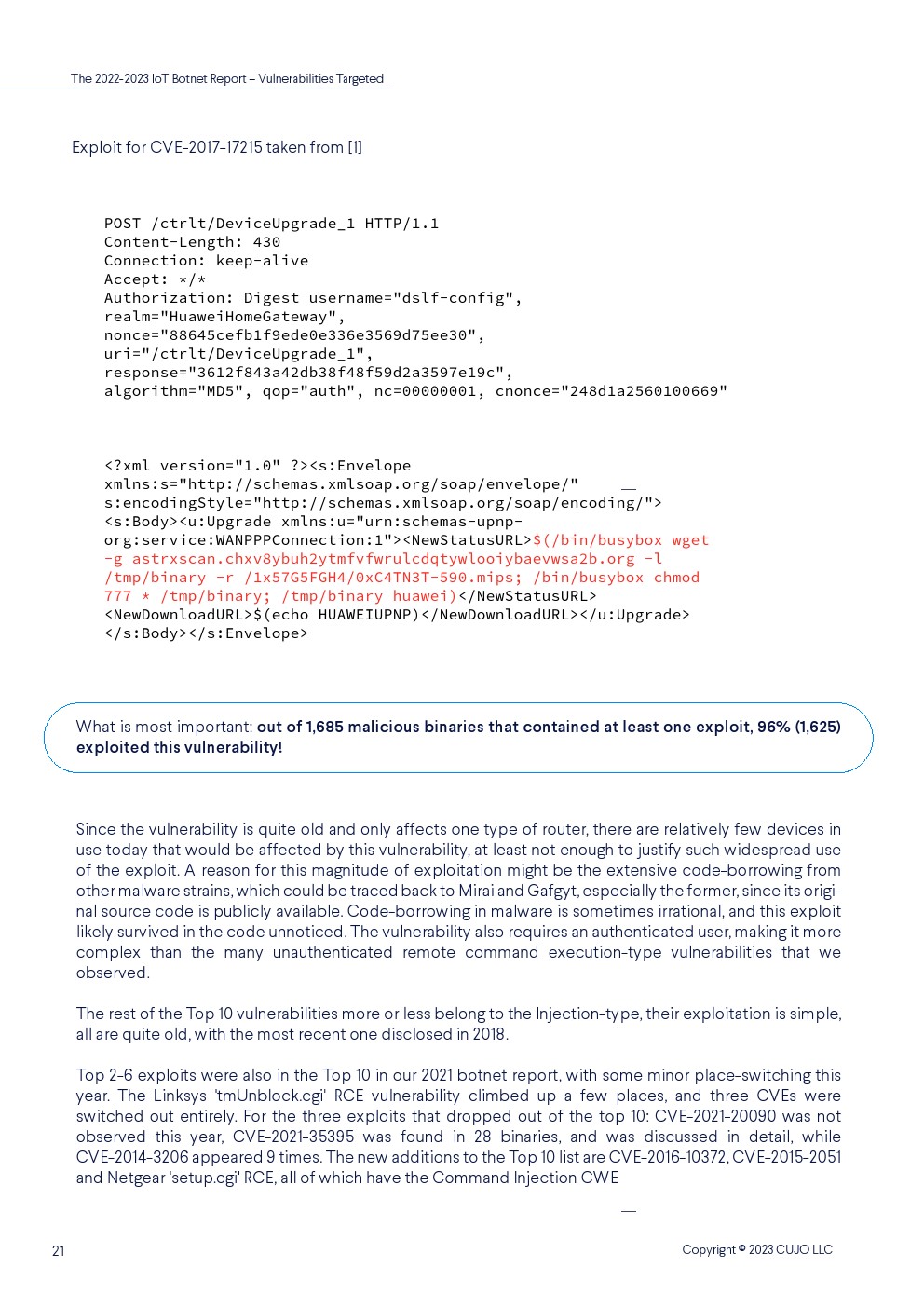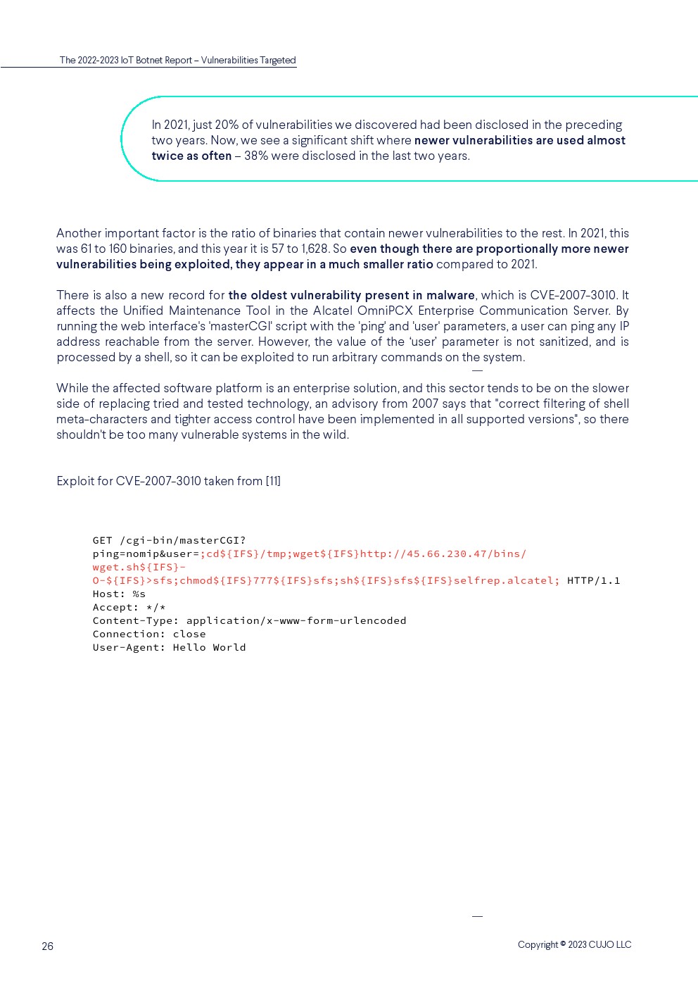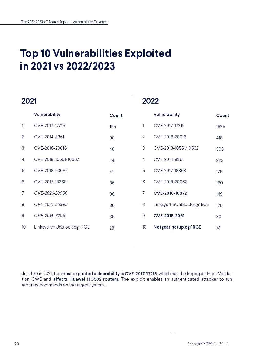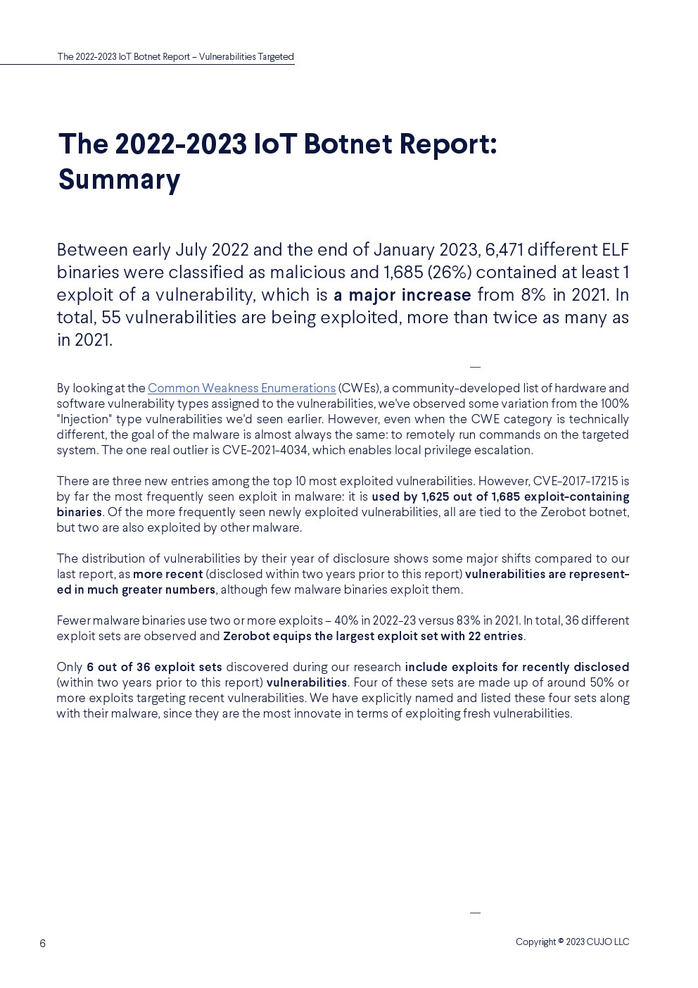 CUJO发布了“2022-2023年物联网僵尸网络报告”。2022年7月初至2023年1月底,有6471个不同的ELF二进制文件被归类为恶意,其中1685个(26%)包含至少1个漏洞利用,比2021年的8%大幅增加。共有55个漏洞被利用,是2021年的两倍多。