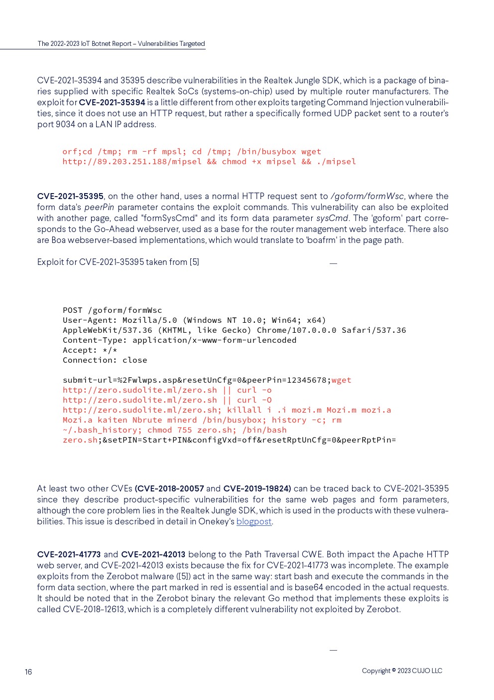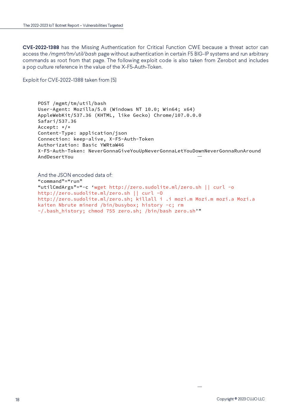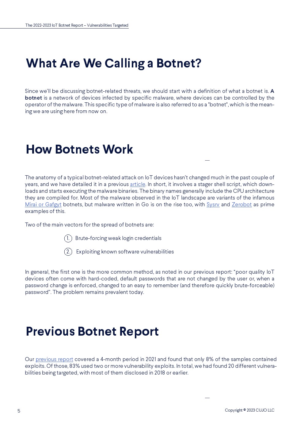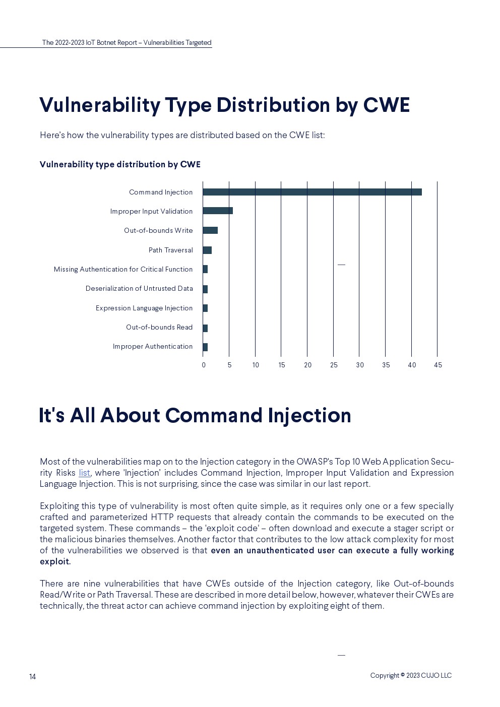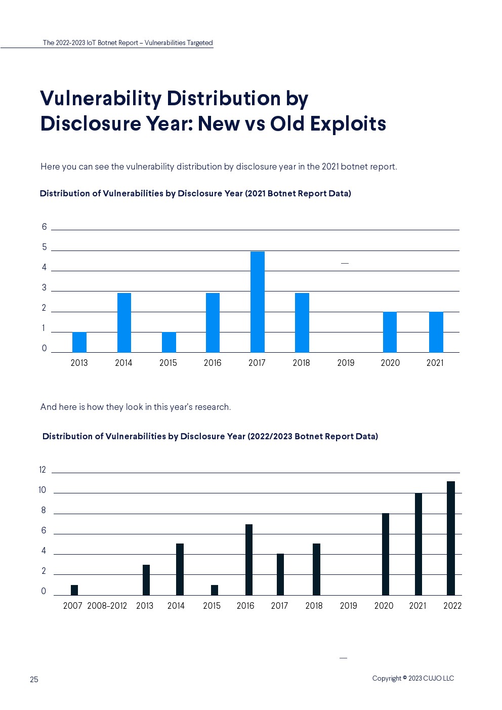 CUJO发布了“2022-2023年物联网僵尸网络报告”。2022年7月初至2023年1月底,有6471个不同的ELF二进制文件被归类为恶意,其中1685个(26%)包含至少1个漏洞利用,比2021年的8%大幅增加。共有55个漏洞被利用,是2021年的两倍多。