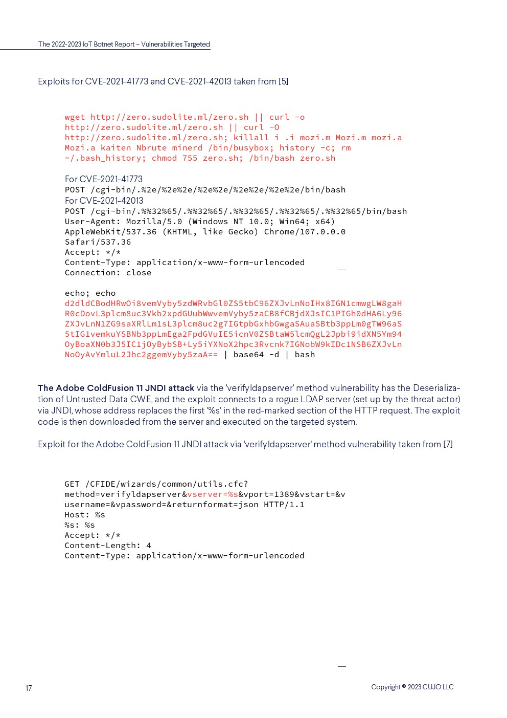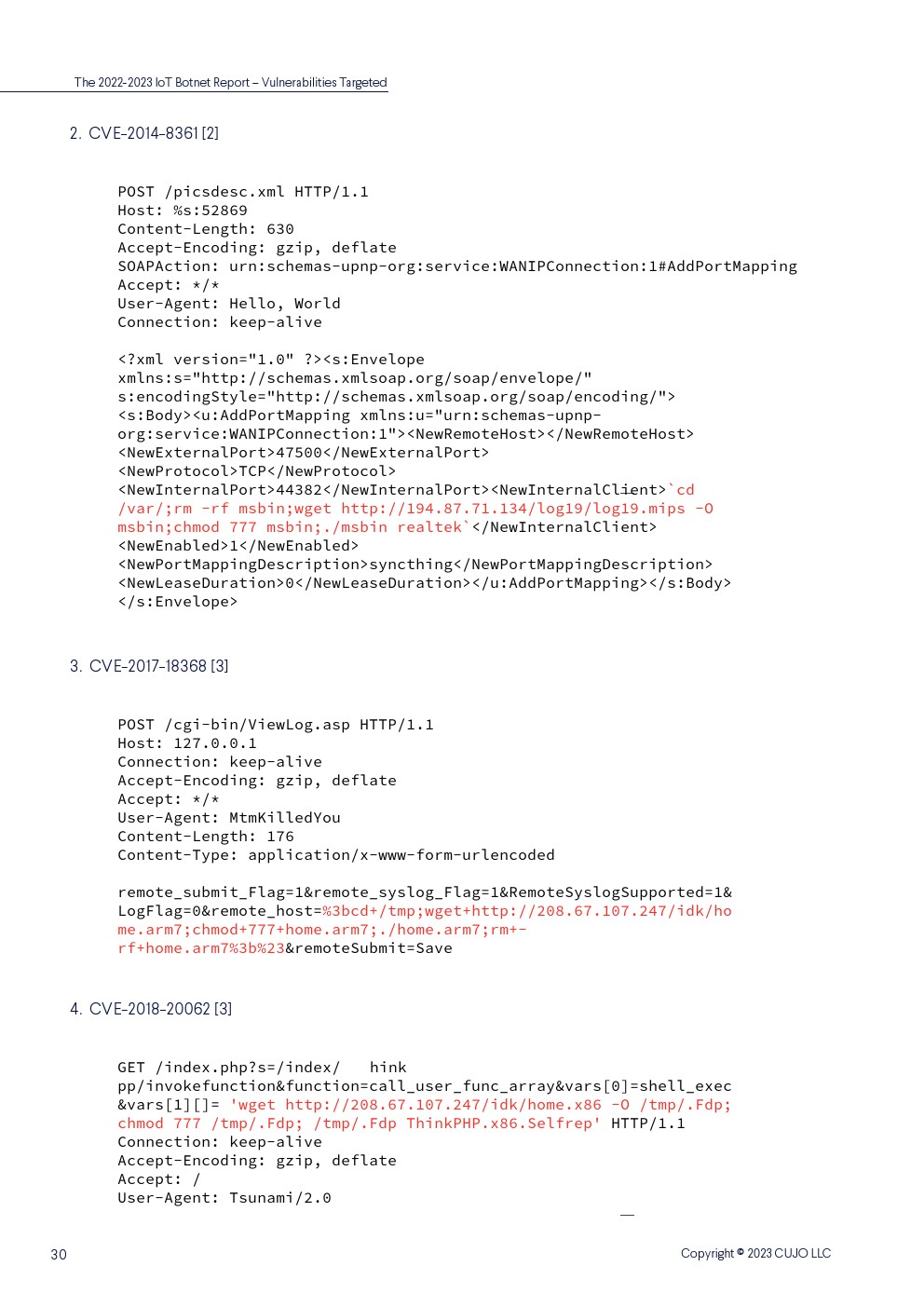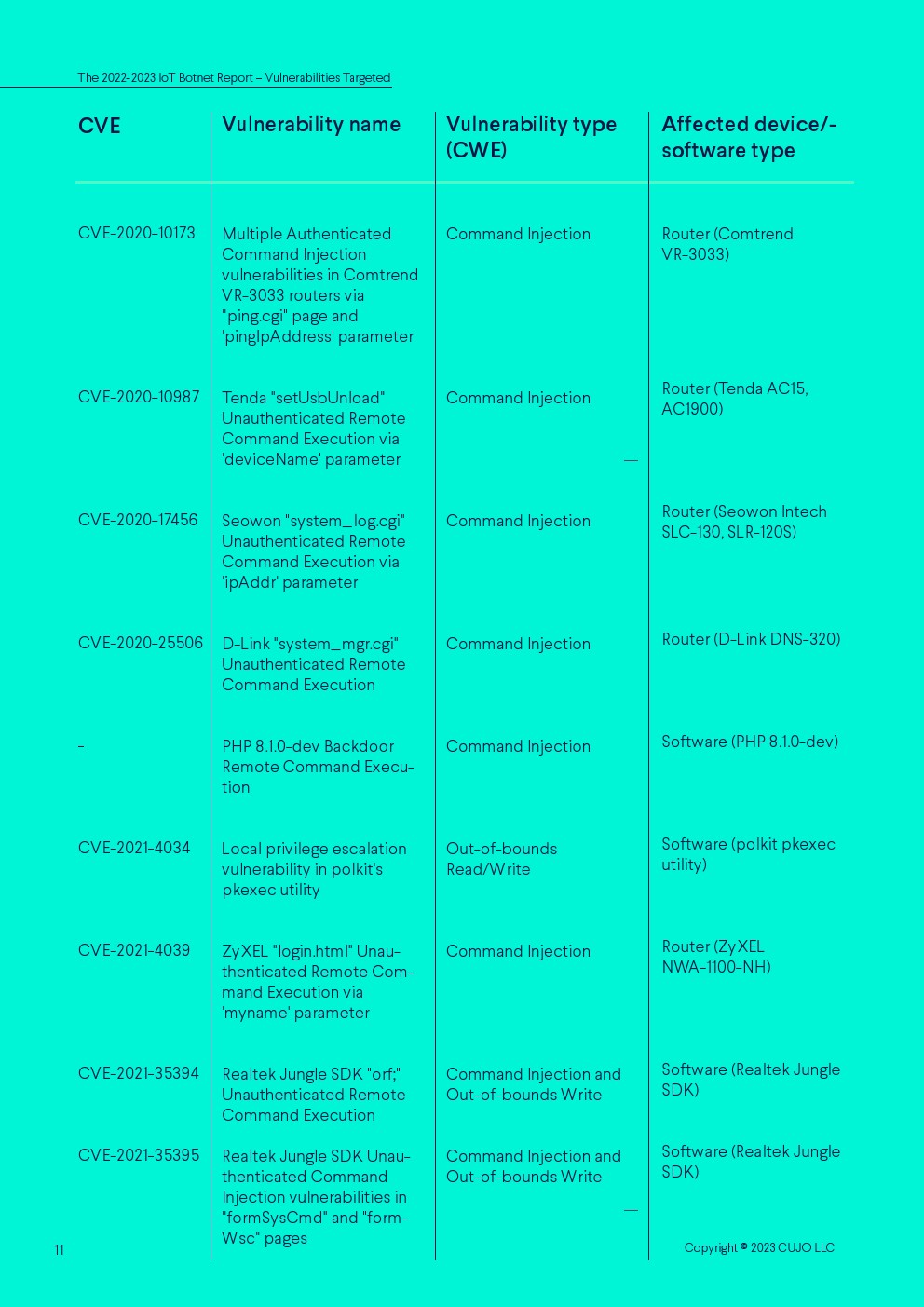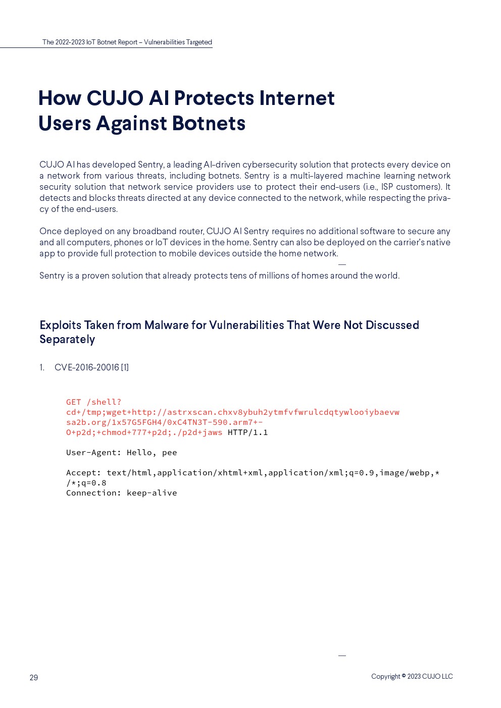 CUJO发布了“2022-2023年物联网僵尸网络报告”。2022年7月初至2023年1月底,有6471个不同的ELF二进制文件被归类为恶意,其中1685个(26%)包含至少1个漏洞利用,比2021年的8%大幅增加。共有55个漏洞被利用,是2021年的两倍多。
