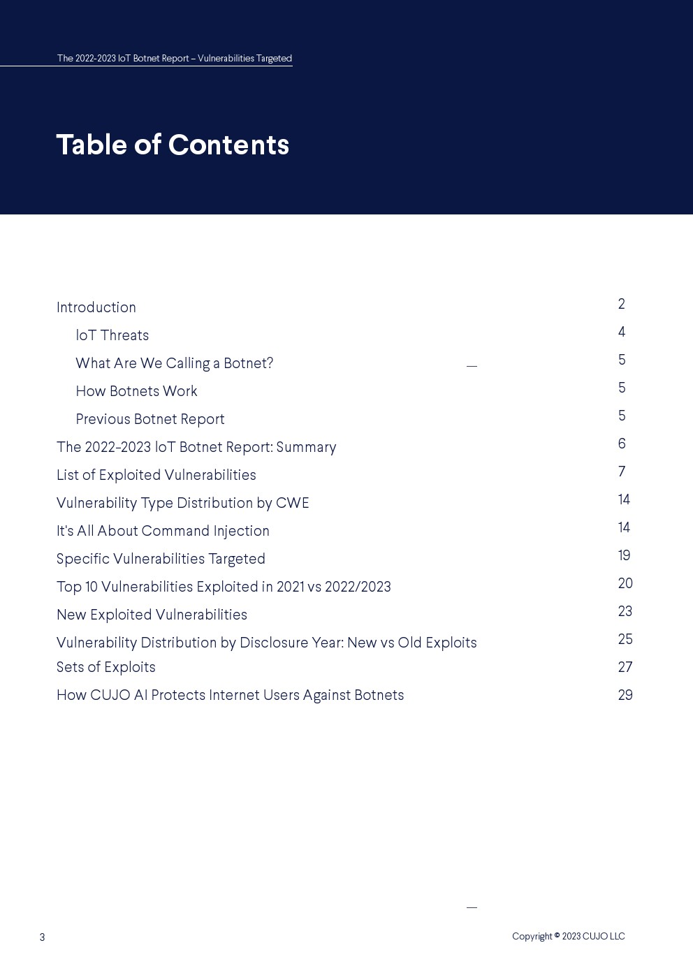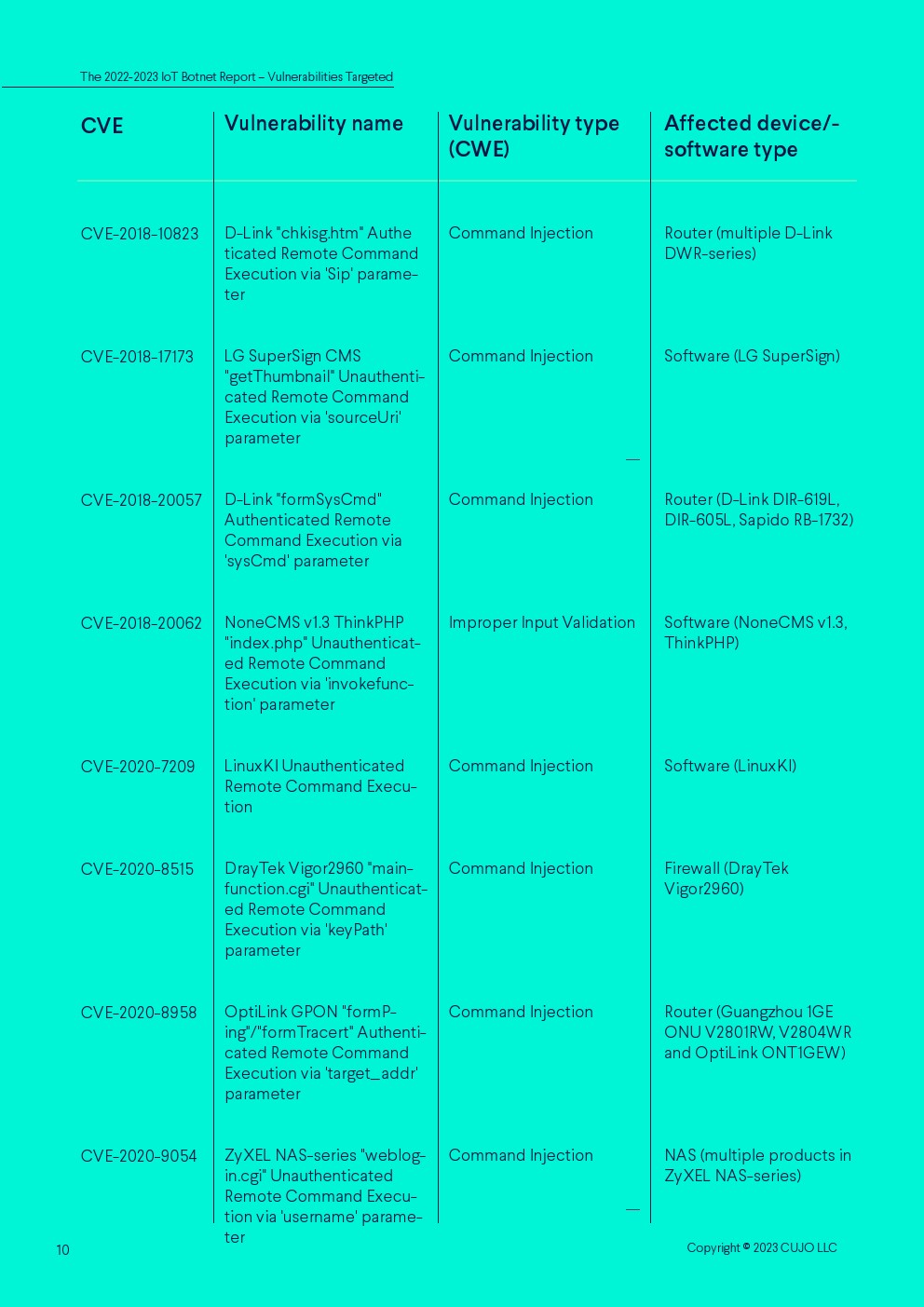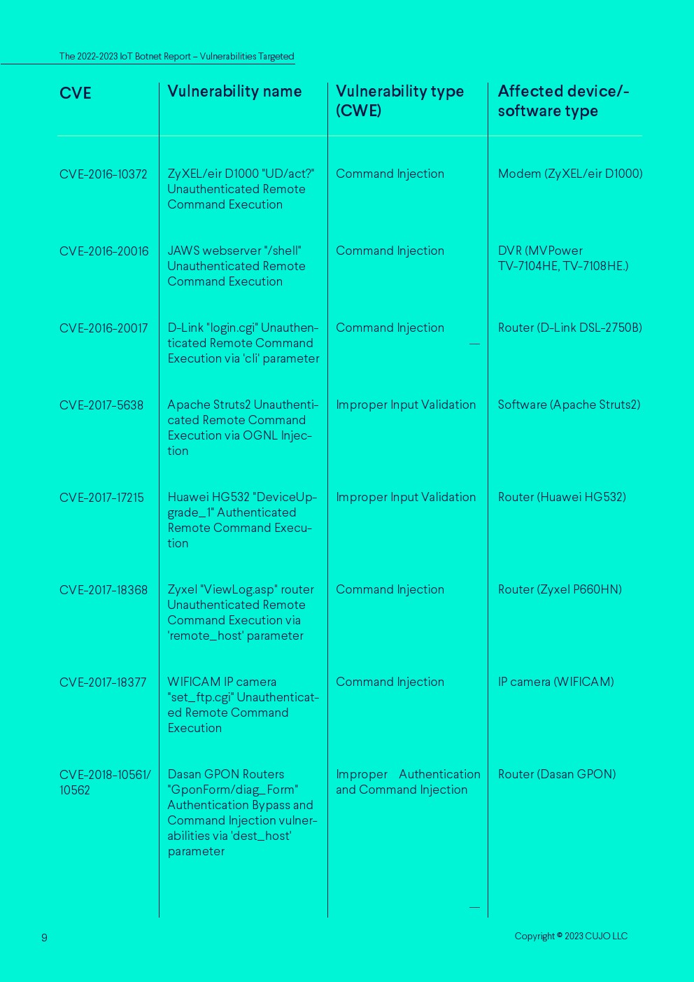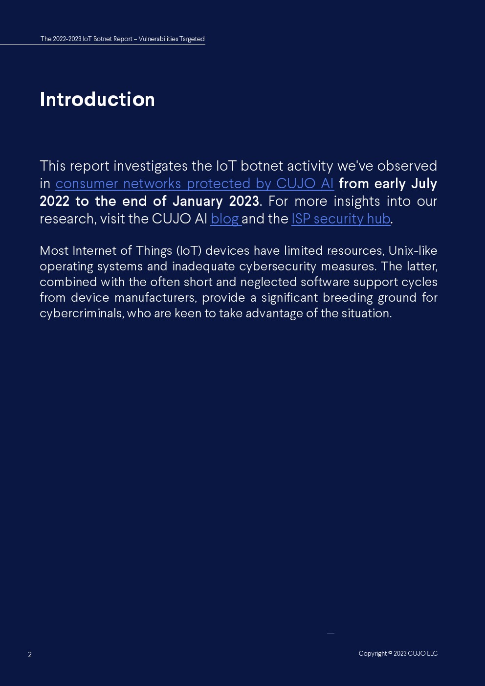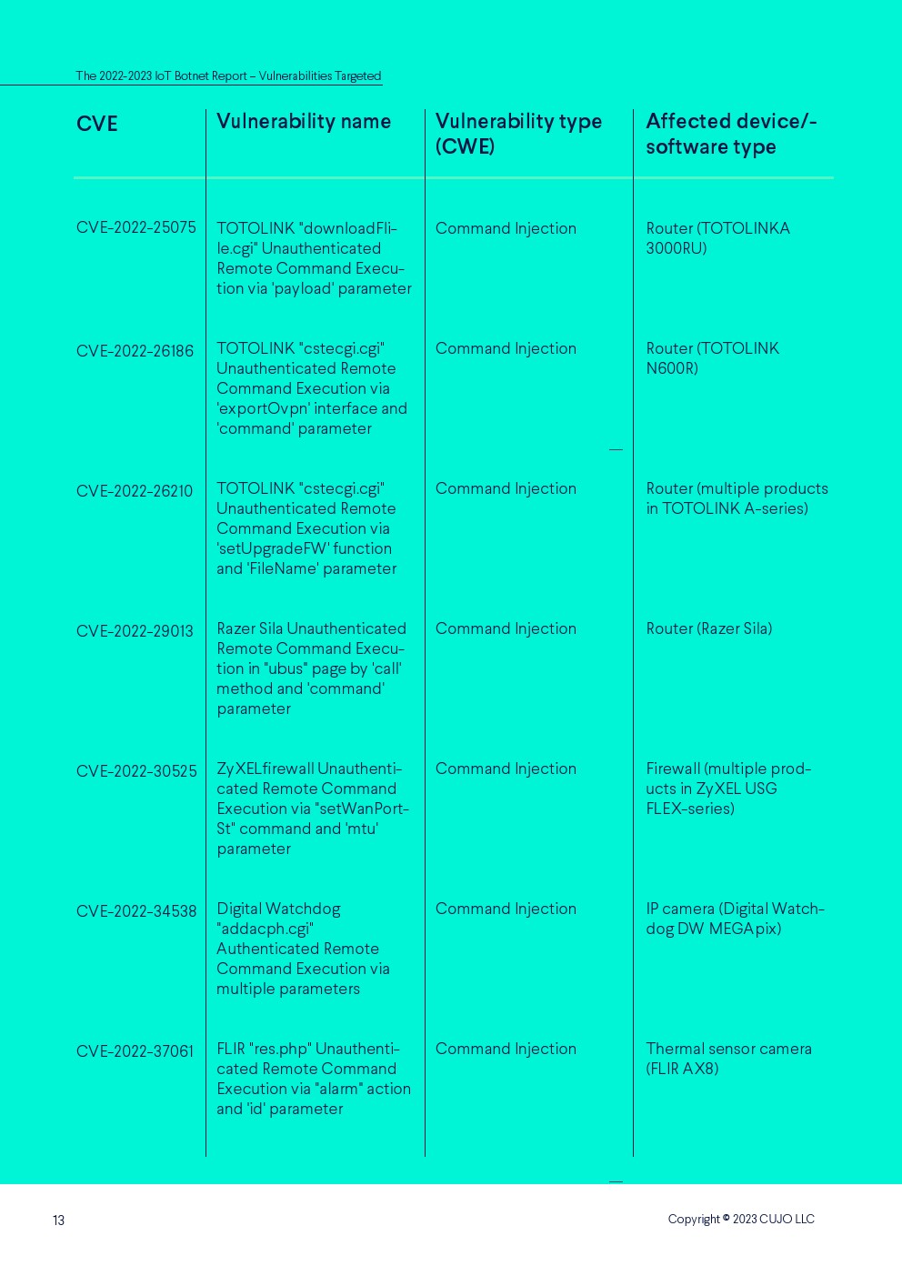 CUJO发布了“2022-2023年物联网僵尸网络报告”。2022年7月初至2023年1月底,有6471个不同的ELF二进制文件被归类为恶意,其中1685个(26%)包含至少1个漏洞利用,比2021年的8%大幅增加。共有55个漏洞被利用,是2021年的两倍多。