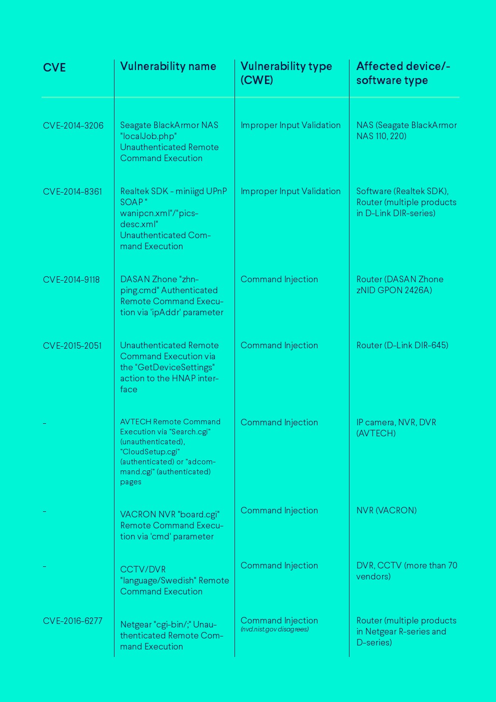 十大最常被利用的漏洞中有三个新条目。但是,CVE-2017-17215是迄今为止恶意软件中最常见的漏洞:在1685个包含漏洞的二进制文件中有1625个使用了CVE-2017-17215。在新近被利用的更频繁的漏洞中,所有漏洞都与Zerobot僵尸网络有关,但也有两个漏洞被其他恶意软件利用。
