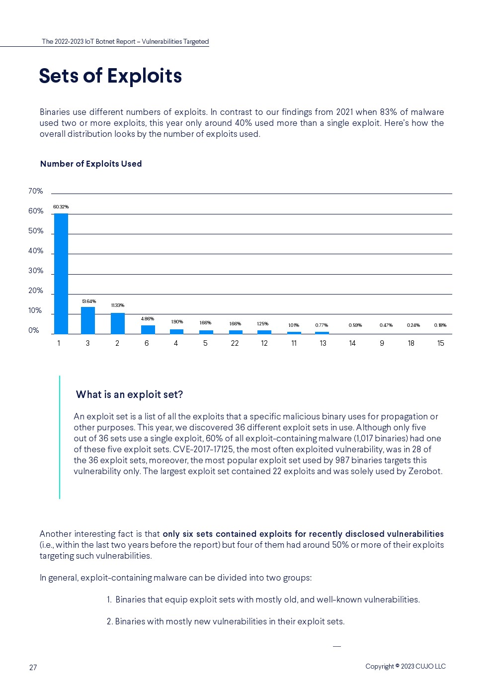 使用两个或更多漏洞的恶意软件二进制文件减少了,2022年-2023年为40%,而2021年为83%。总共观察到36个不同的攻击集,Zerobot为最大的攻击集配备了22个条目。