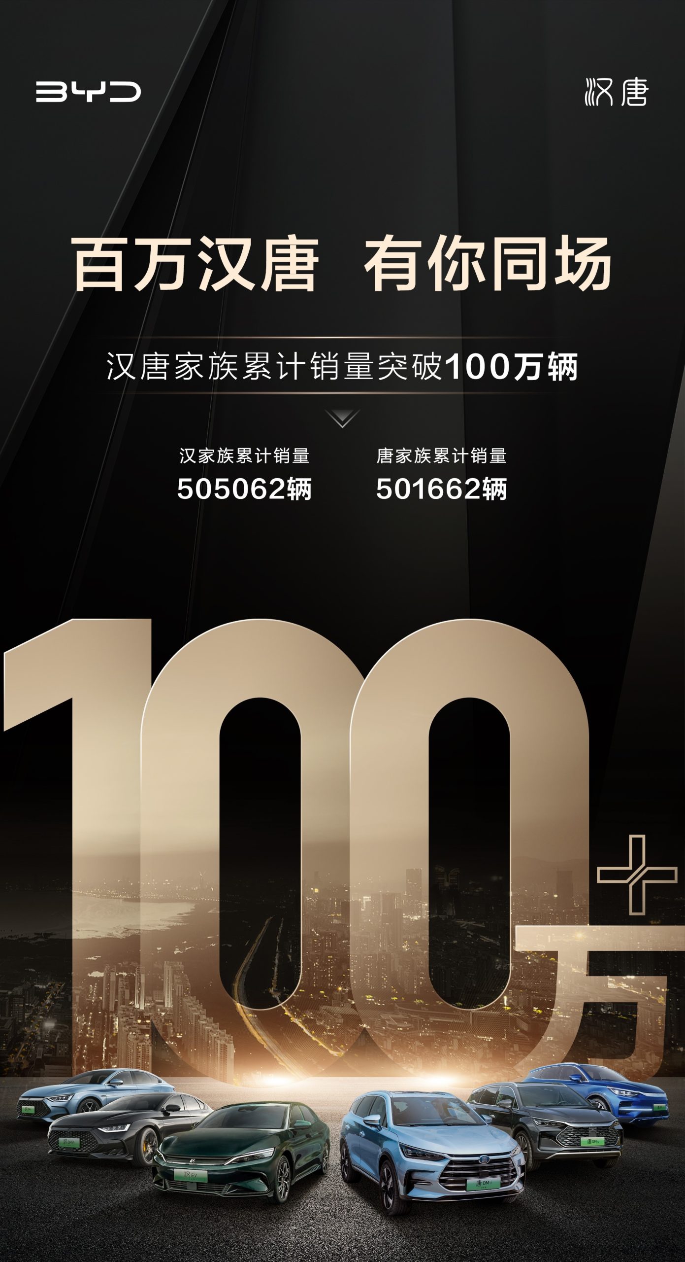 据比亚迪汽车官方,旗下汉唐家族累计销量突破100万辆,其中汉家族为505062辆,唐家族为501662辆,双双突破50万!