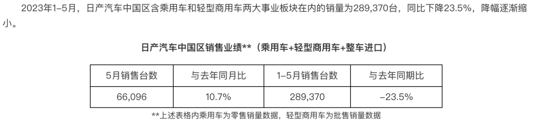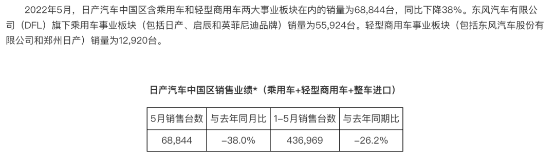 但自2022年10月起,东风汽车股份有限公司销量不再纳入日产中国区中。意味着,日产公布的2022年5月销量实际上为(乘用车+轻型商用车+整车进口)的总计销量,其中轻型商用车包括东风商用车和郑州日产。