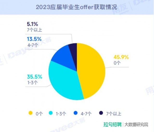 《报告》显示,45.9%的应届生未获offer。在面试环节,35.1%的应届生表示只参加了5家以内企业的面试,31.9%的应届生表示仍未获得企业面试机会。与此同时,有20%的高校毕业生们拿到4个及以上的校招offer。
