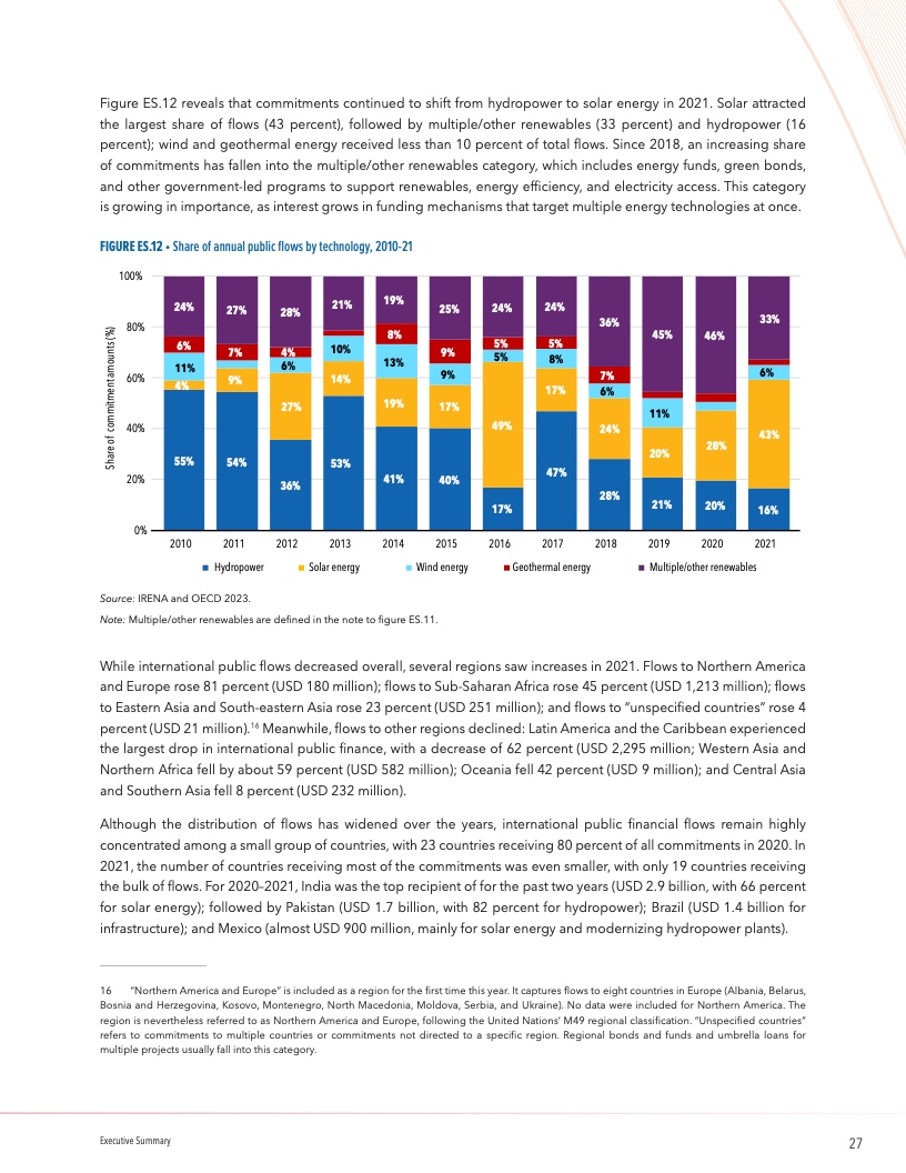 但报告同样发现,在2021年用于支持发展清洁能源的国际公共资金当中,流向发展中国家的为108亿美元,比2010年至2019年的平均水平低35%,仅为2017年峰值264亿美元的40%左右;而且资金只掌握在少数的发展中国家手中,其中19个国家就占到了八成的资金承诺。