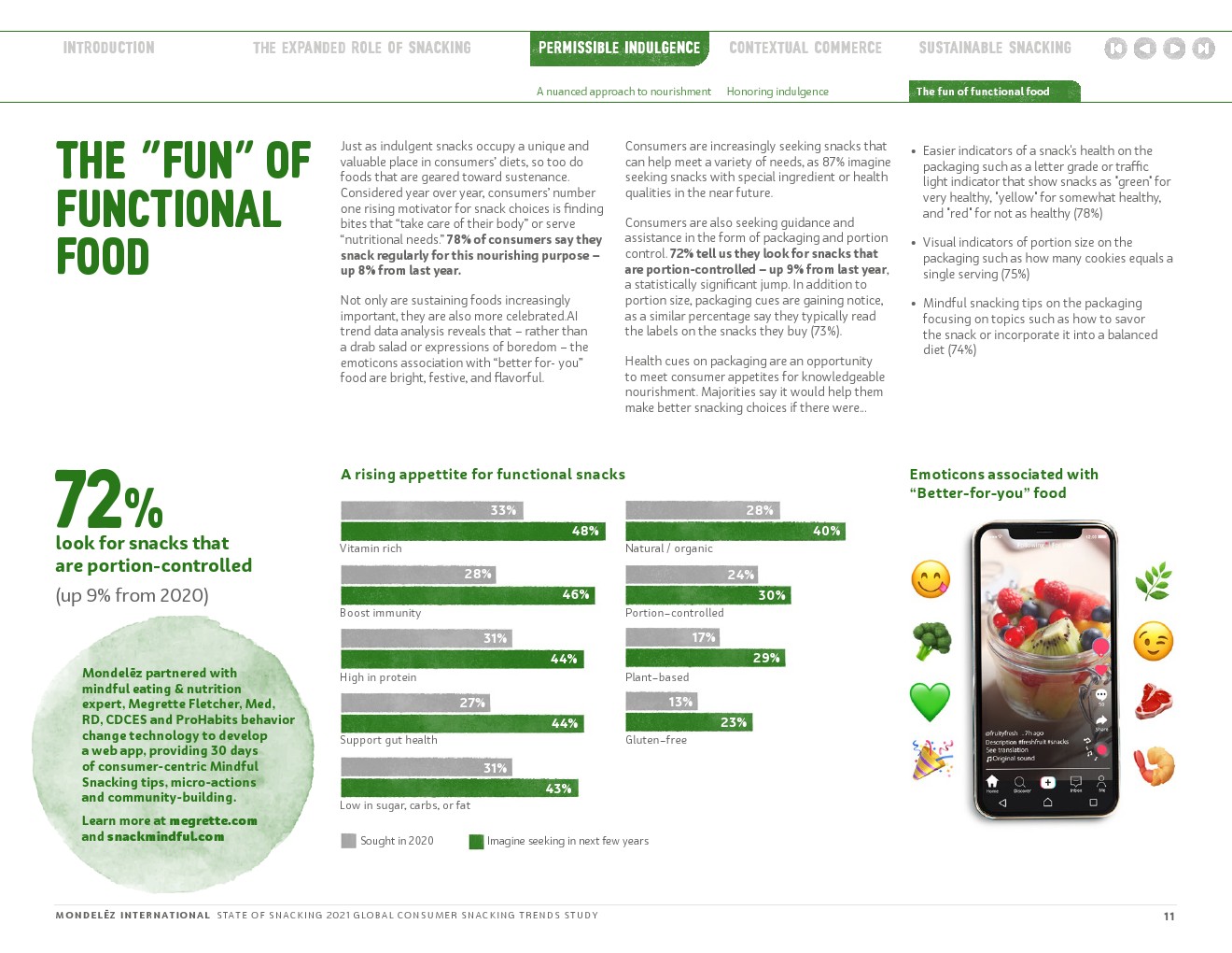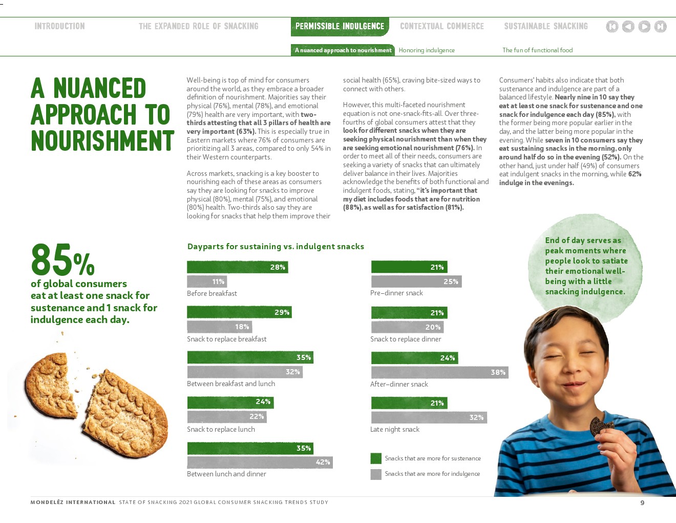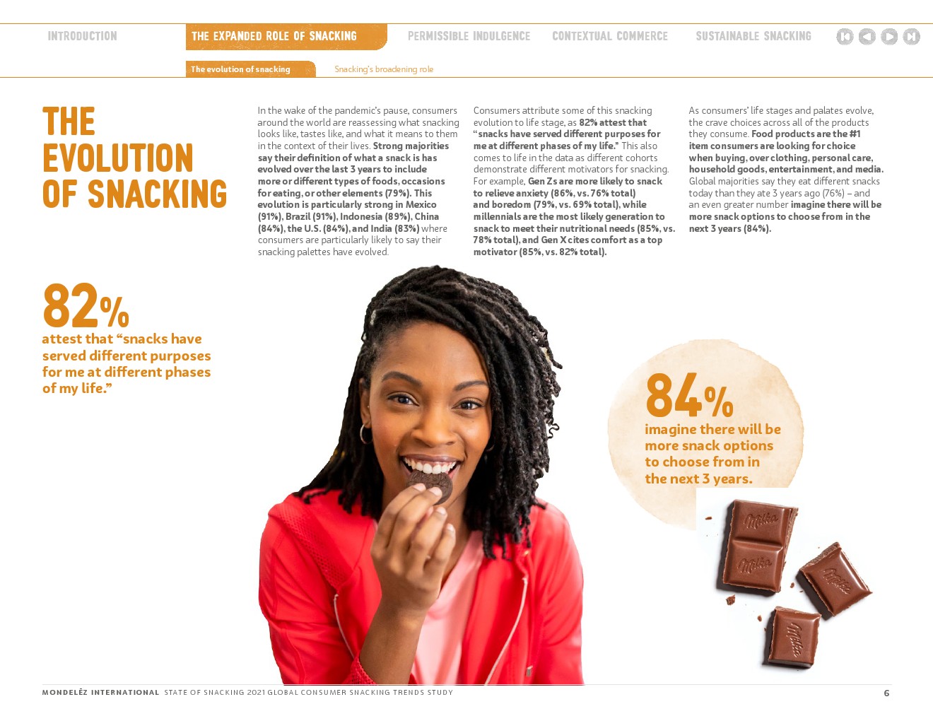 随着世界不断适应变化的动态,与消费者保持密切联系仍然是我们的首要任务。这样做可以让我们更好地理解零食在消费者生活中扮演的不断变化的角色,探索如何更好地与他们建立联系,以满足他们的生理、心理和情感健康需求;了解消费者吃零食的灵感来自哪里;并揭示他们的零食和购物习惯是如何演变的,以更充分地符合他们的价值观。