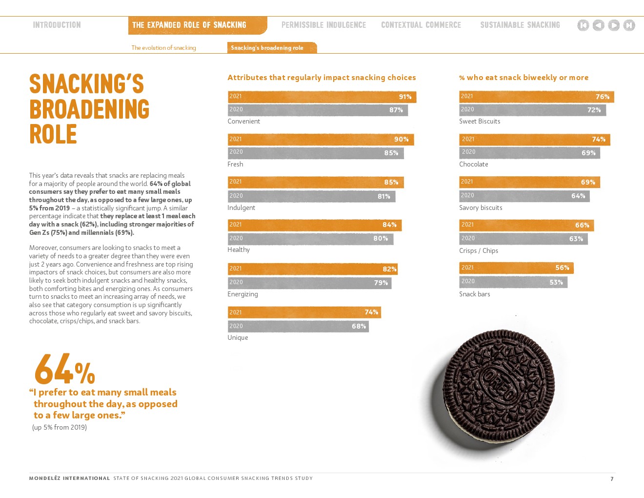 64%的人喜欢在一天中多吃几顿小食,而不是几顿大餐。(比2019年增长5%)