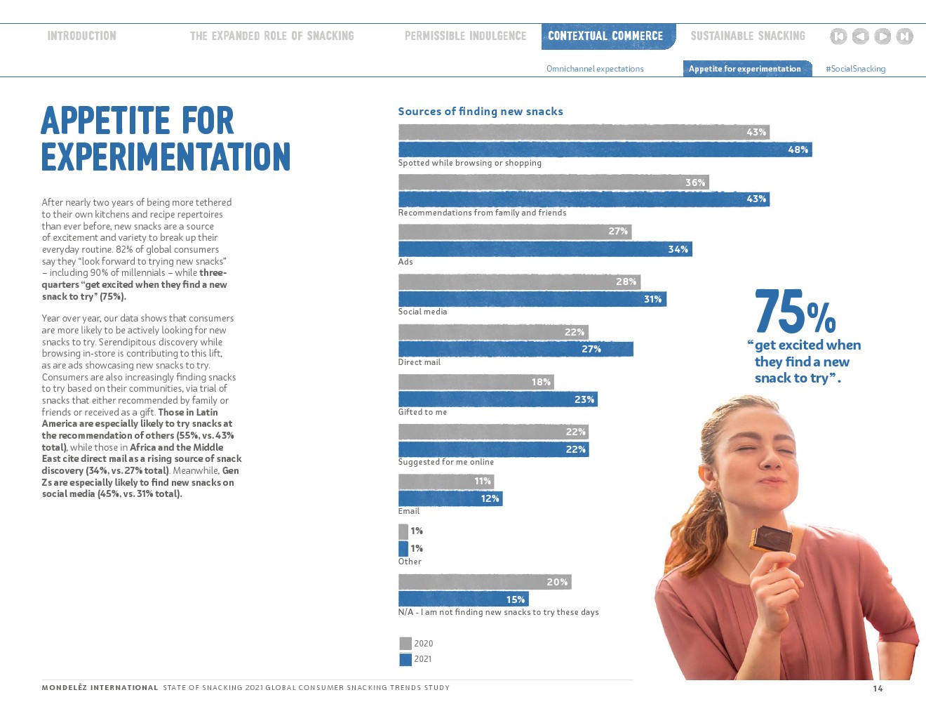 55%的人表示,在过去的一年里,社交媒体促使他们尝试了一种新的零食。(比2019年增长5%)