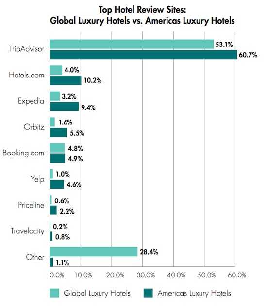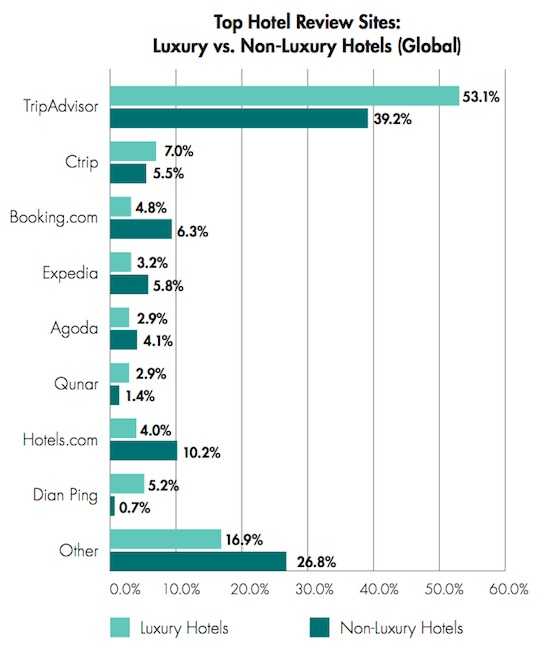 Brand Karma和International Luxury Travel Market的调查显示,TripAdvisor贡献了豪华酒店在美国61%、全球53%的用户点评数量。